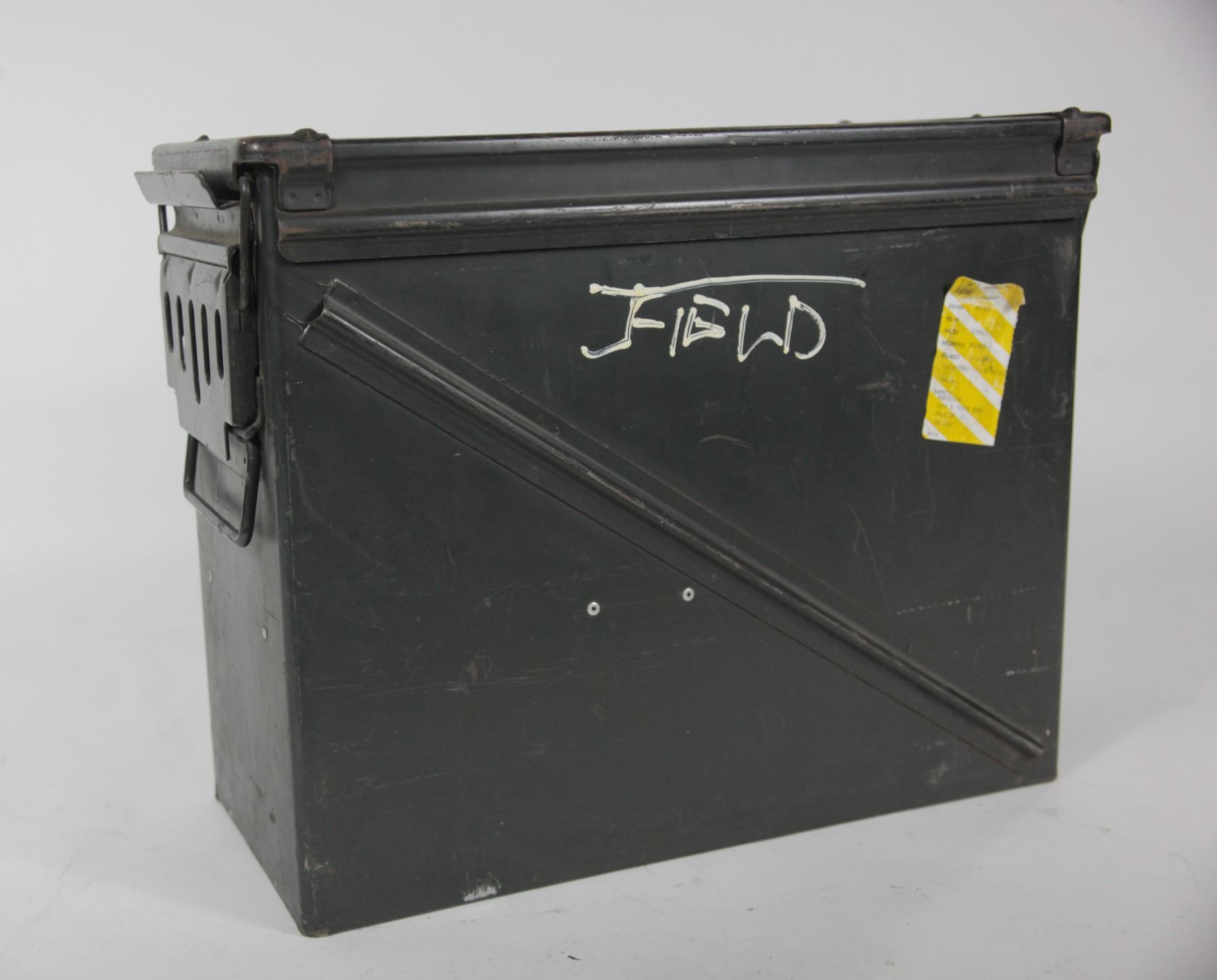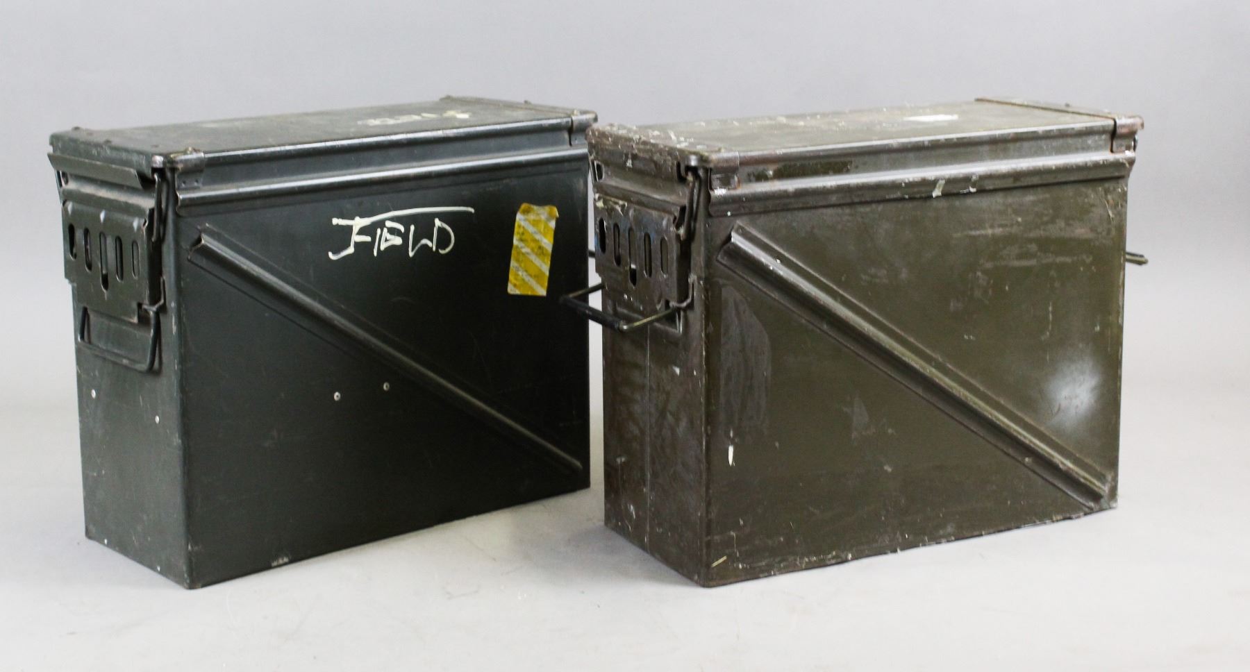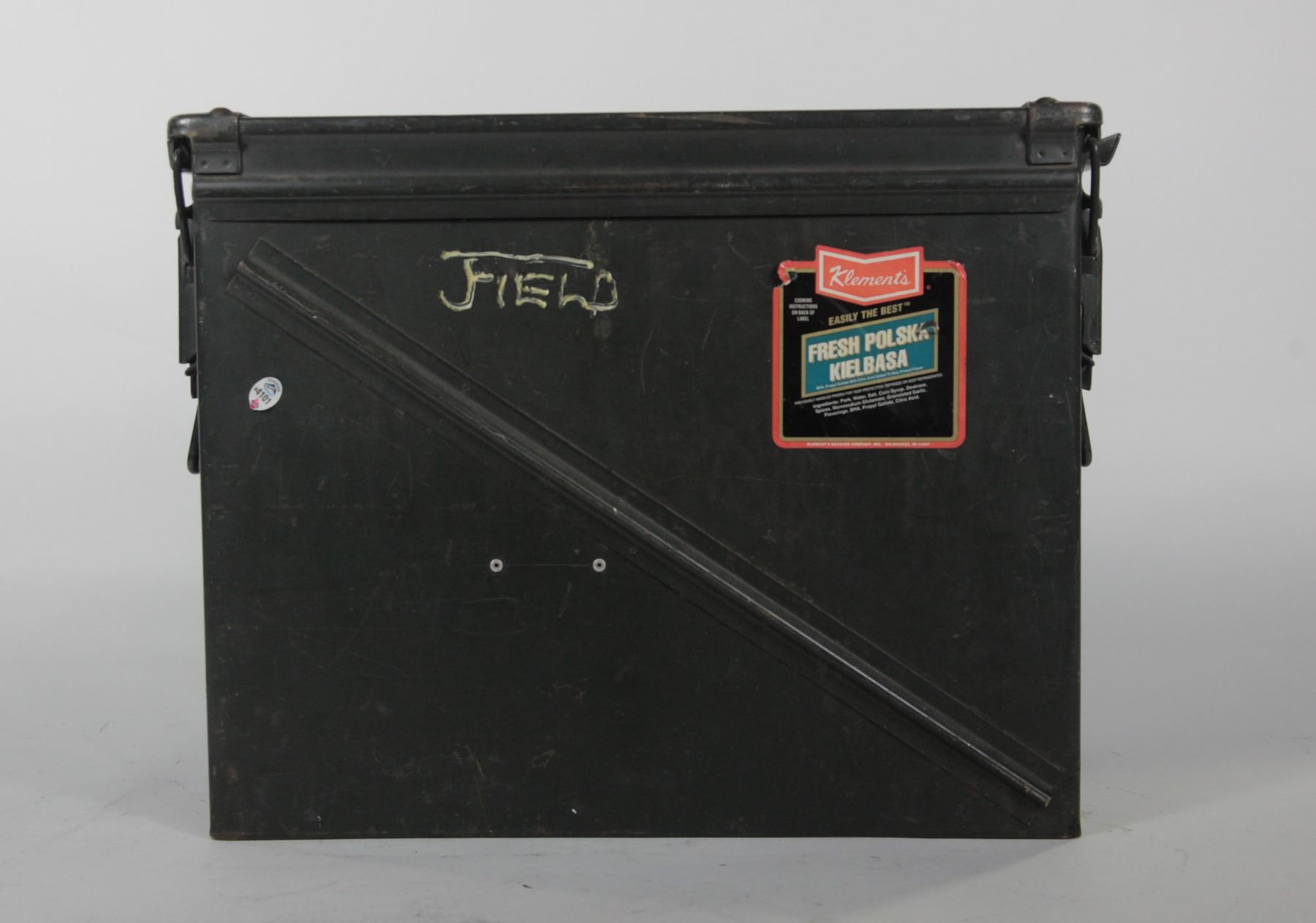 Two large ammo cans with one having the word "Field" written on the top, front, and back. Inside the Field can is two inserts that act as shelves. Field can was wear on the edges of the lid and has a few stickers on it. The other can has had the markings ground off on the front and top. Both cans function as intended. See photos.