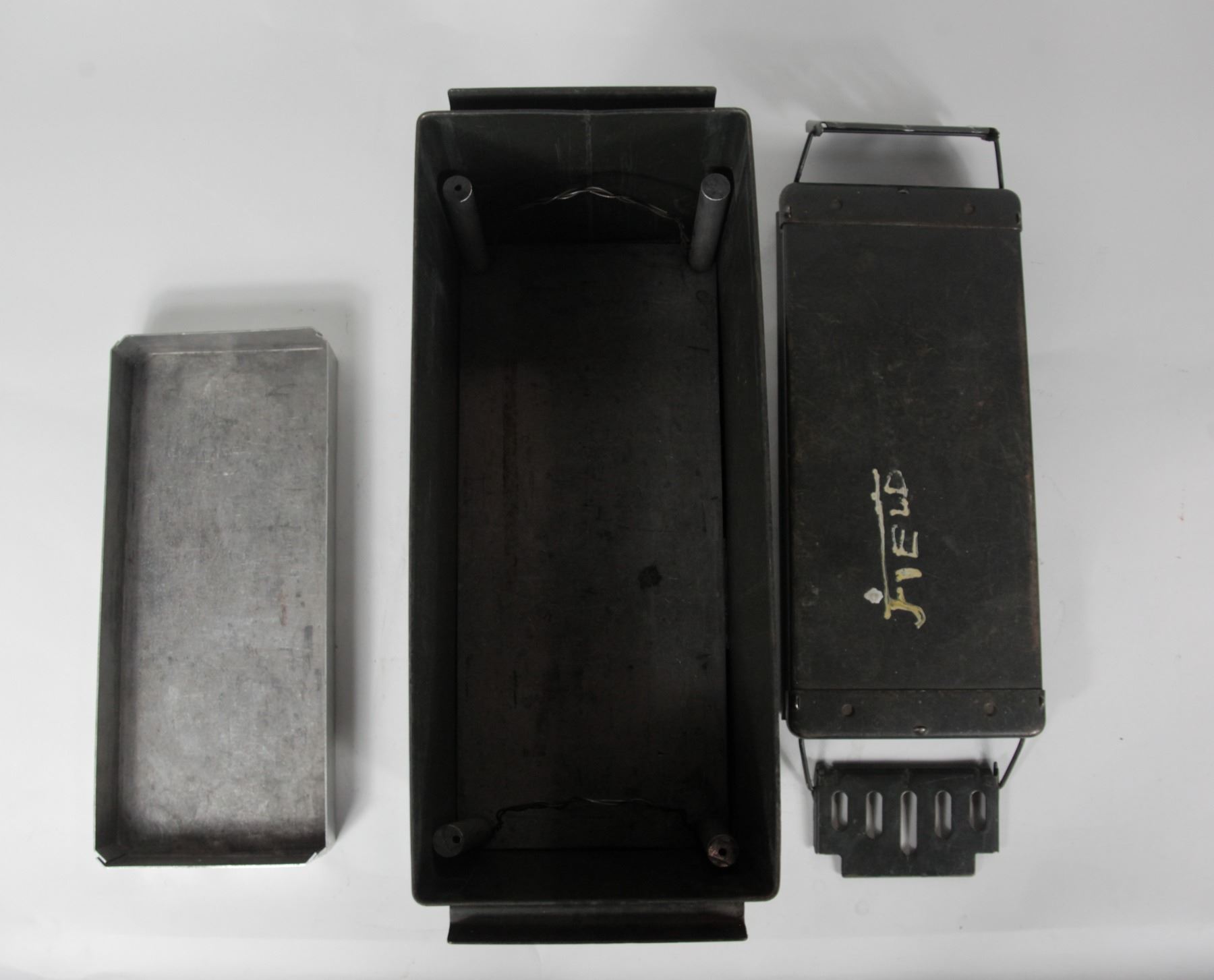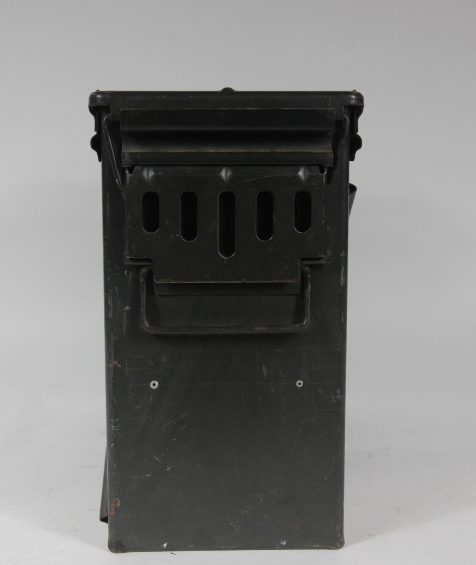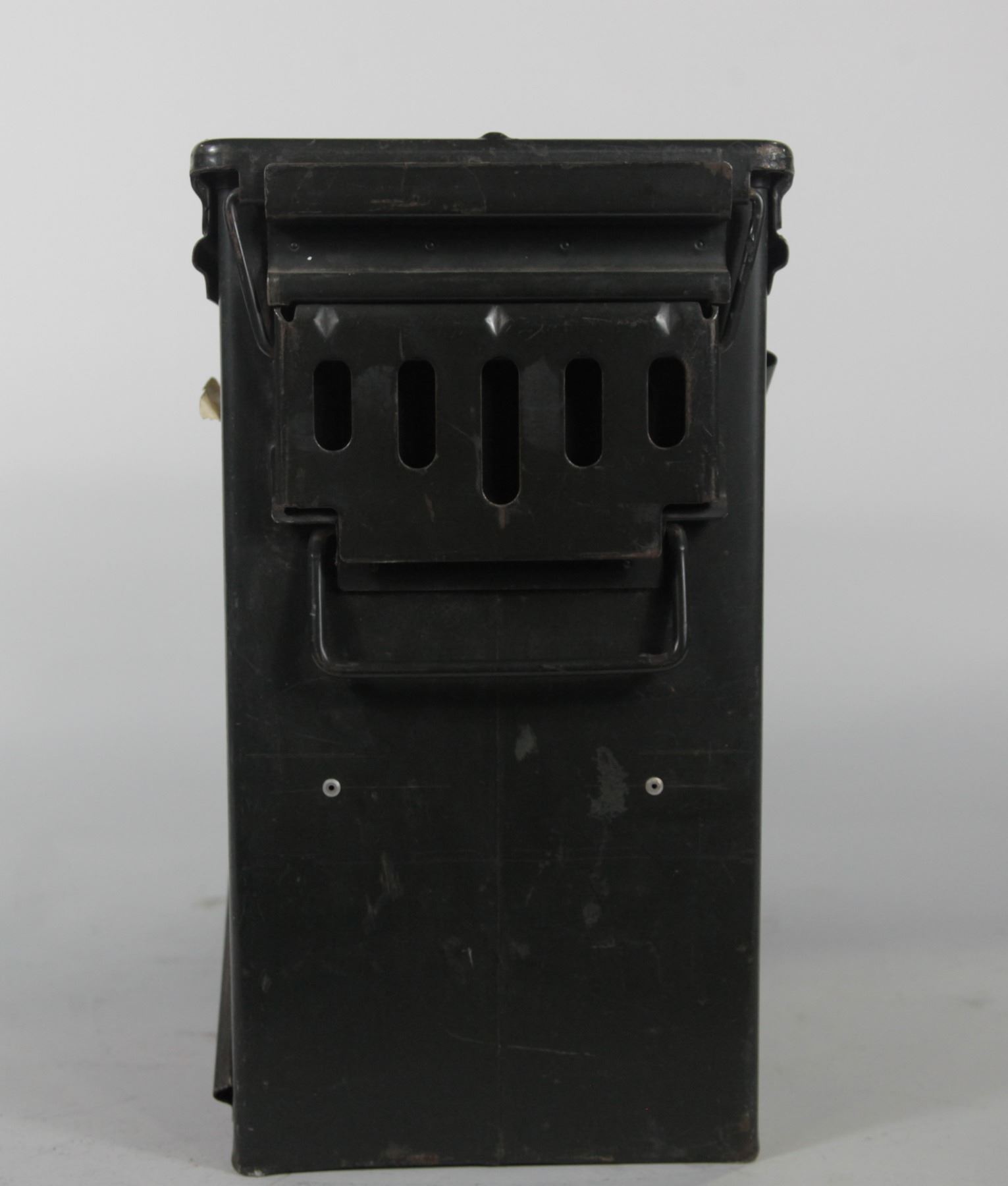 Two large ammo cans with one having the word "Field" written on the top, front, and back. Inside the Field can is two inserts that act as shelves. Field can was wear on the edges of the lid and has a few stickers on it. The other can has had the markings ground off on the front and top. Both cans function as intended. See photos.