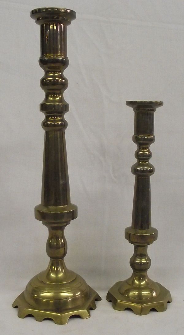 From the Proctor collection, Silver City, NM. Heavy pieces. The tallest piece measures 19'', the shorter is 14''. The receptacle on the large piece takes a 1 1/2'' candle while the other a 1''. Shorter stick is marked ''Hecho en Mexico''.
