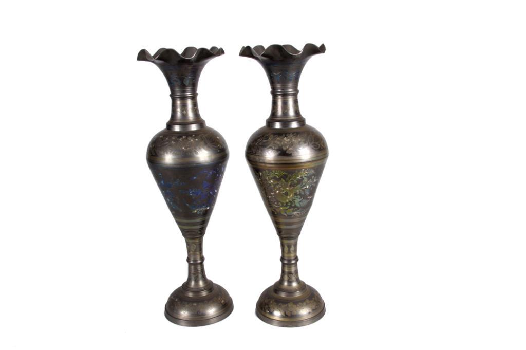 Two Large Etched Decorated Brass Vases Each measures 30"H. In overall good condition.Each measures 30"H. In overall good condition.
