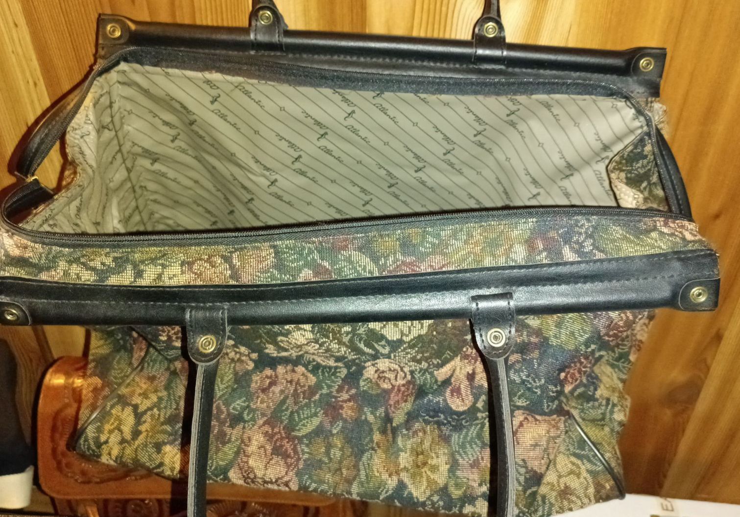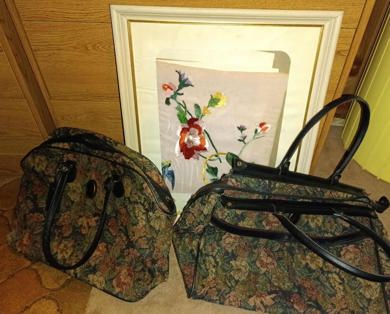 Two Large Floral Carry-On Bags w/ Framed Embroidery Textile