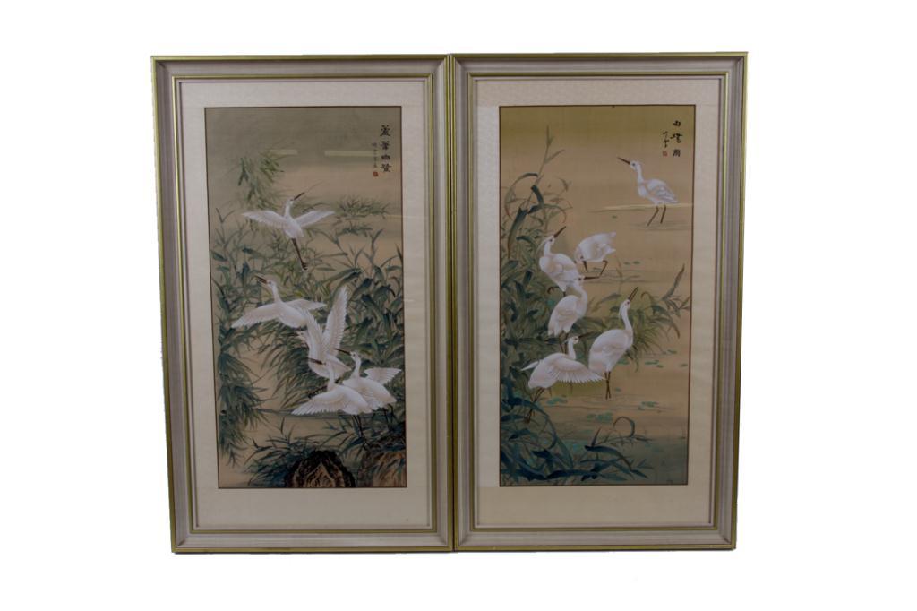 Two Large Oriental Woodblock Style Prints Depicting Egrets on the shore. Each measures 30 1/2"x52".Depicting Egrets on the shore. Each measures 30 1/2"x52".