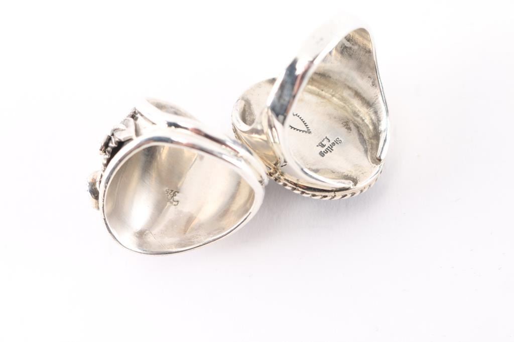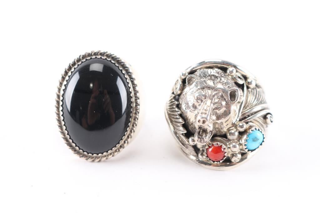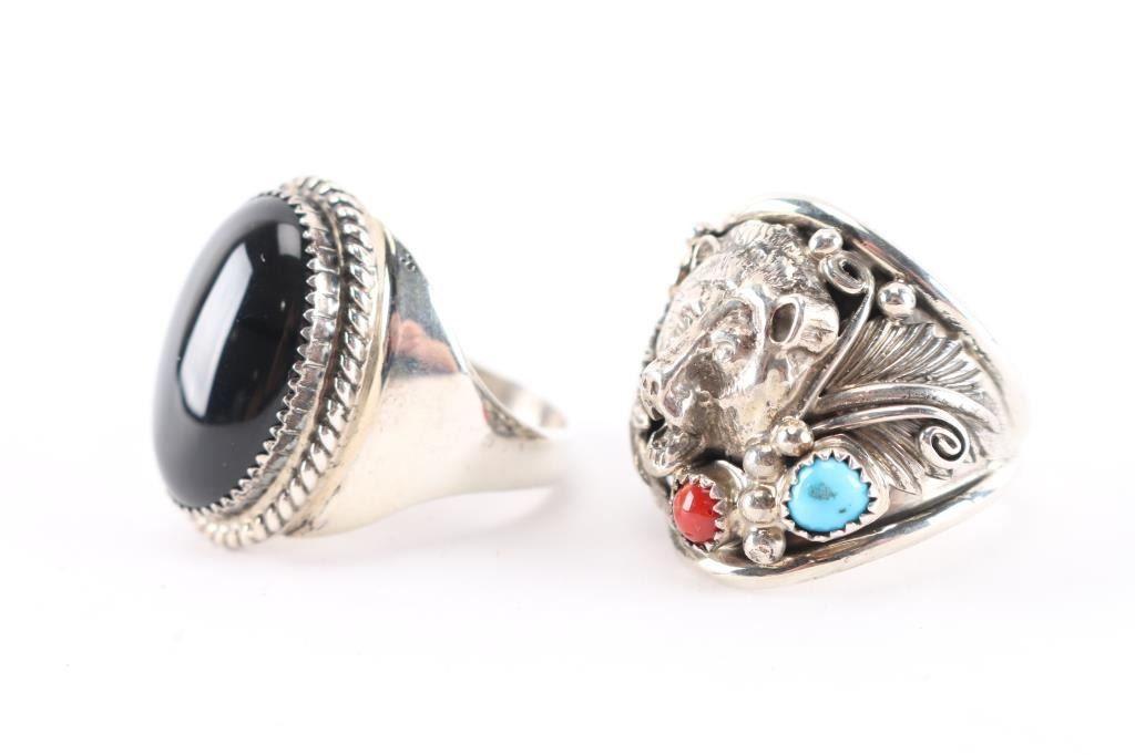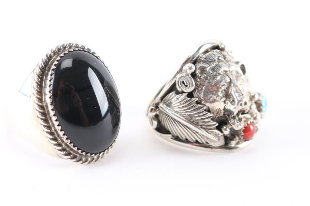 (1) Sterling silver and onyx mens ring, large cabochon at center, maker marked, size 15.(1) Sterling silver wolf with round stones of turquoise and coral accent, maker marked, size 14.