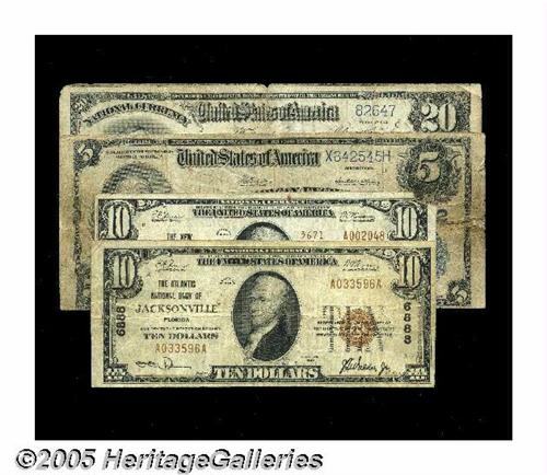 <B>Two Large, Two Small From the South.</B></I><BR>Mobile, AL - $20 1902 Plain Back Fr. 651 The First NB Ch. # 1595 VG-Fine<BR>Jacksonville, FL - $10 1929 Ty. 1 The Atlantic NB Ch. # 6888 Fine<BR>New Iberia, LA</B></I> - $10 1929 Ty. 2 The New Iberia NB</B></I> Ch. # 3671 Fine, missing corner<BR>Greensboro, NC</B></I> - $5 1902 Plain Back Fr. 602 The American Exchange NB Ch. # 10112 VG-Fine, repair.<BR>