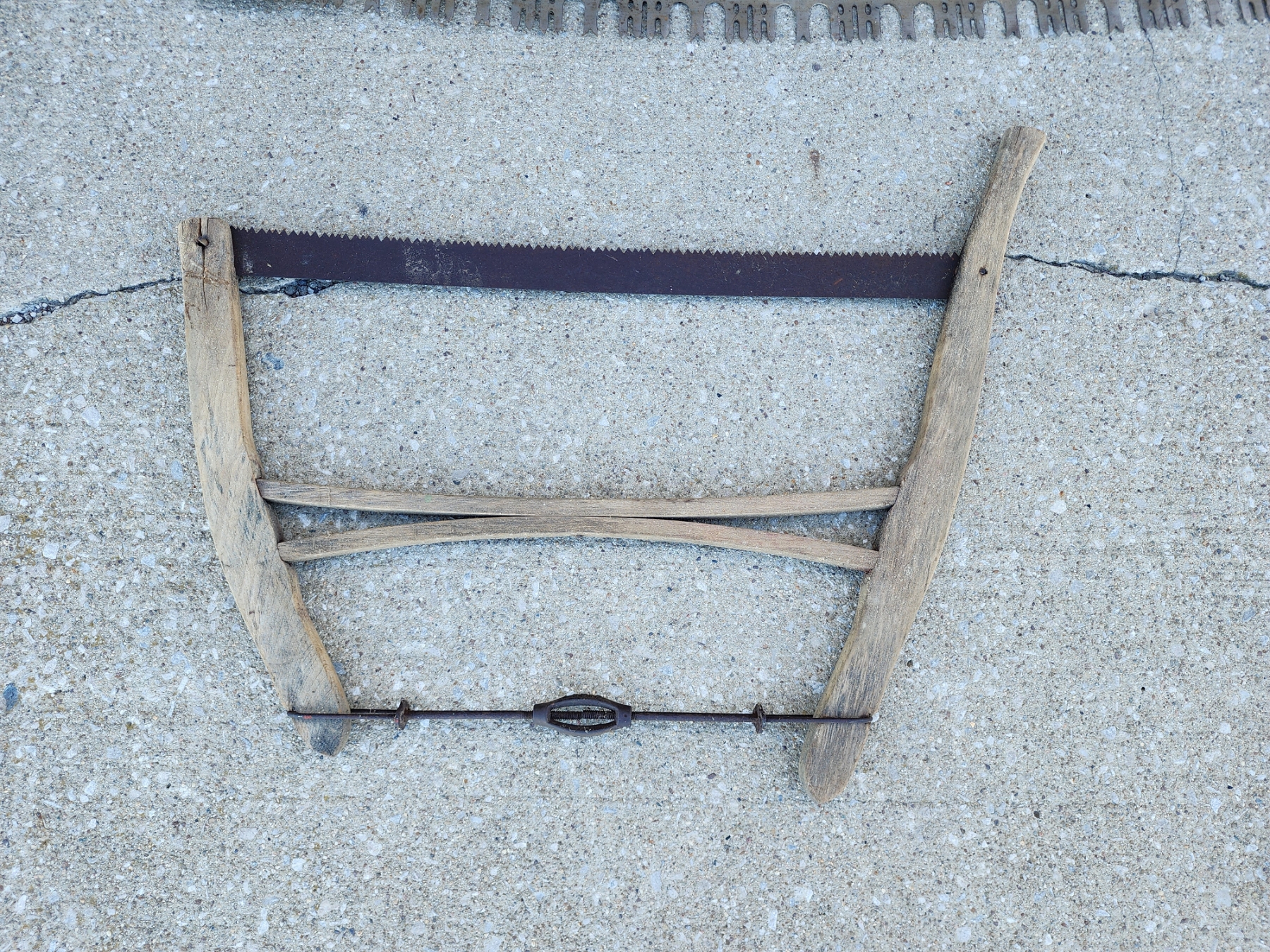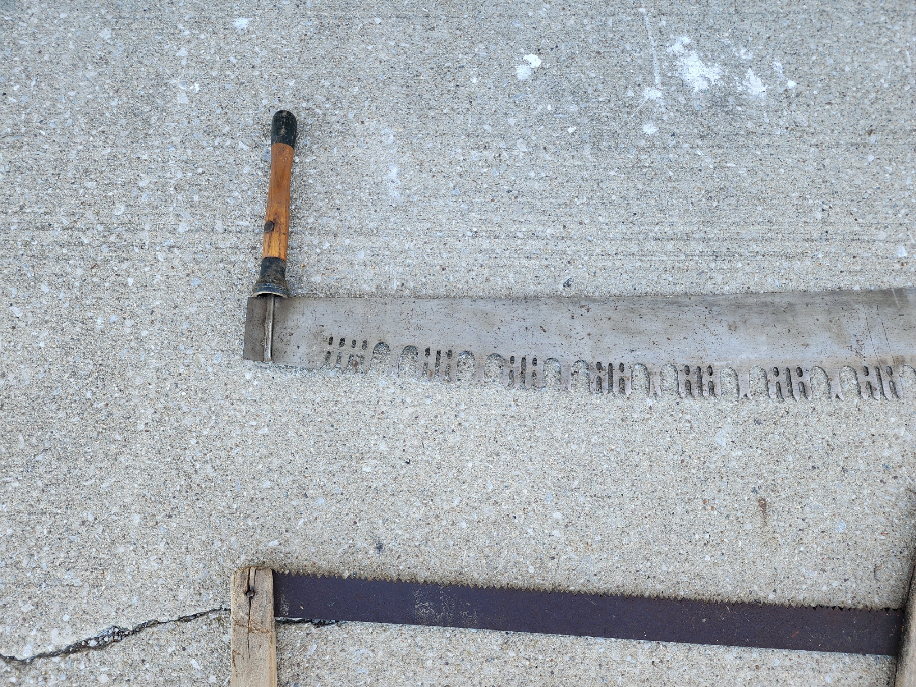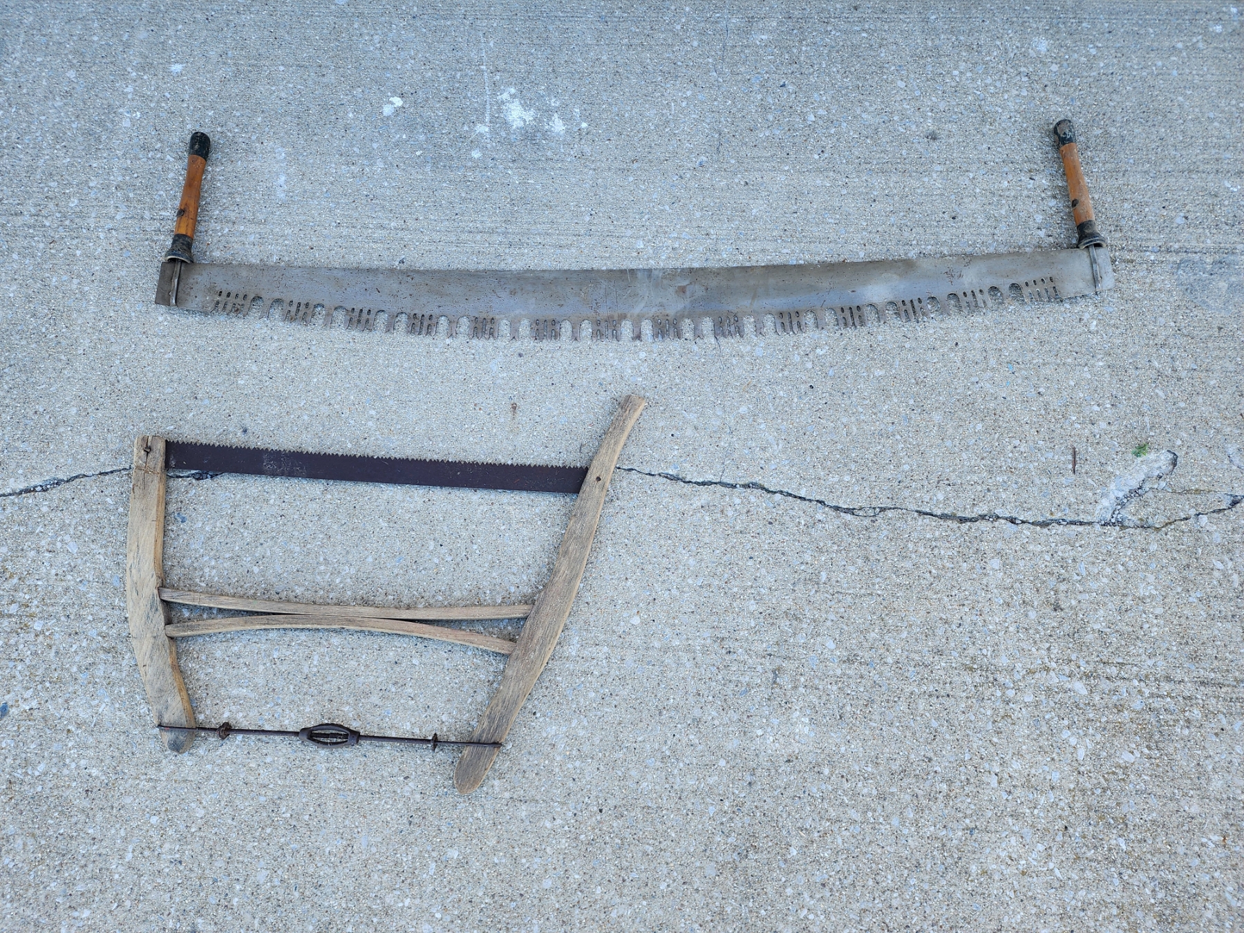 Two Large Vintage Farm-Rustic Saws: Two-Person Crosscut Saw and Buck Saw