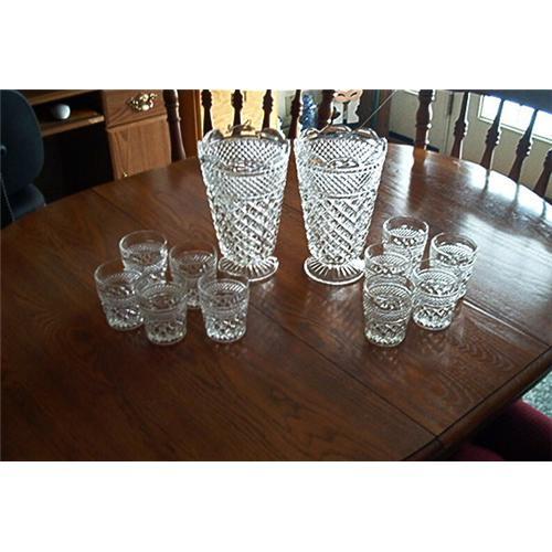 Featuring two, heavy, vintage, waffle weave designed vases along with 10 matching glasses. Maker unknown. Also contains diamond point top edgeing along with scalloped top vases. The vases measures 10 1/4 inches tall; opening diameter measures 6 inches; depth measures 9 1/2 inches. Base diameter measures 4 1/2 inches; The matching glasses measures 3 3/4 inches tall; depth of 3 1/4 inches; opening diameter measures 3 inches; base diameter measures 2 1/2 inches. All pieces are in excellent to mint condition. All are heavy for their sizes too. Excellent to mint condition on all pieces. No chips, cracks, etc. If someone knows the maker, please let me know.