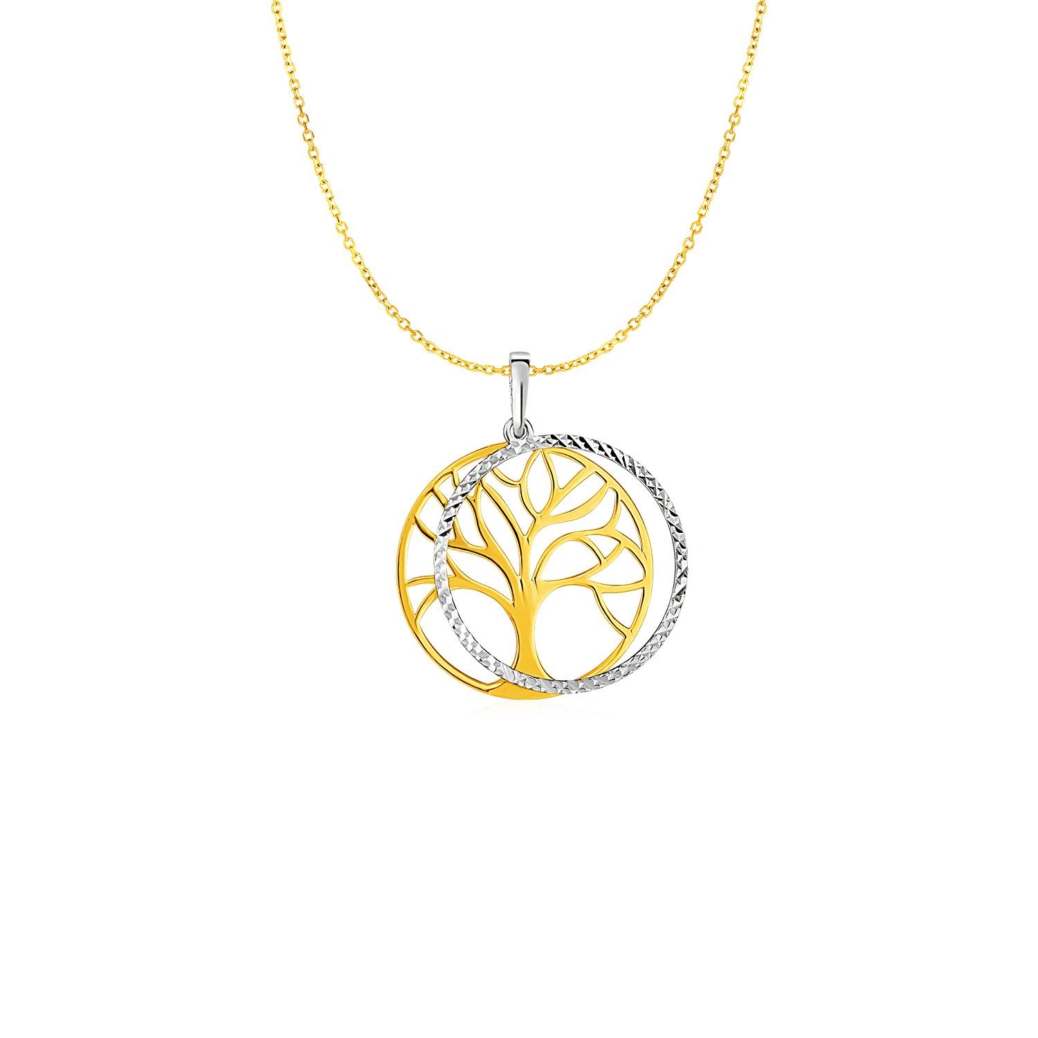 A round textured frame surrounds the classic tree of life on this beautiful gold pendant in yellow and white gold. Pendant is closes with a lobster clasp.