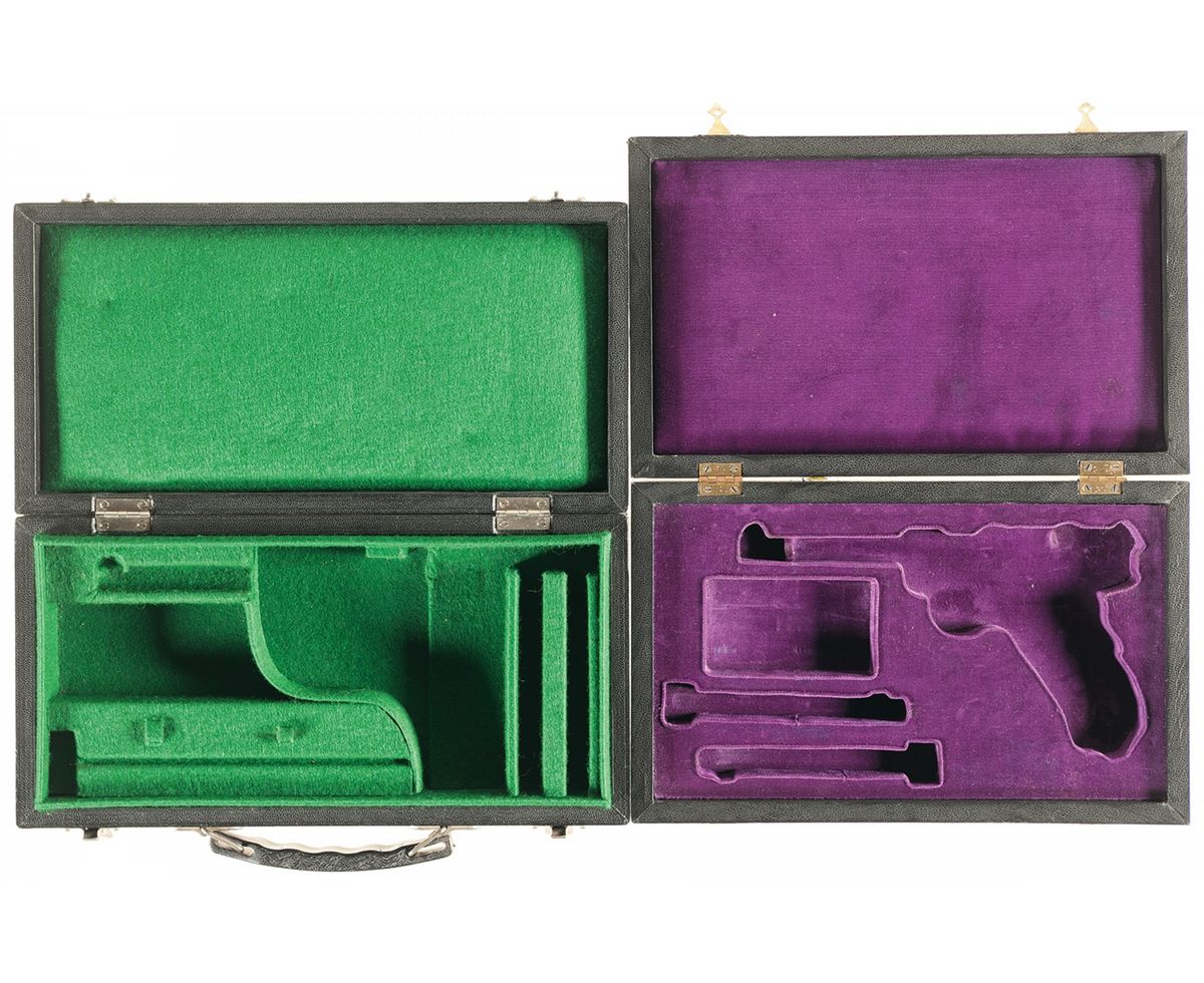 1) Black with purple fitted lining for a Luger semi-automatic pistol. Very good with the hardware slightly darkened and a little edge and corner wear. Black with green fitted lining for a Luger or European style semi-automatic pistol. Reproduction, very good with a few edge marks.