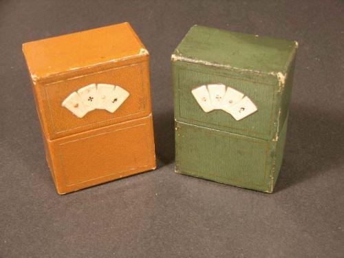 Two leather playing card cases with celluloid card suits on lid. Green and brown, holds 2 decks. 4" x 3" x 2" Ex. cond.