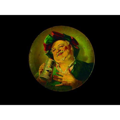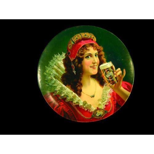 Two Lemp Beer Tin Chargers, St. Louis, MO, Woman has some minor scratches at 3:00 and around the edge otherwise very good condition, Man has some rust spots throughout otherwise good condition. Both 16 inch diameter.