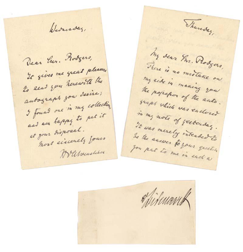 JOHANN FRIEDRICH VON ALVENSLEBEN (1836-1913) German diplomat and ambassador. Autograph Letter Signed, "J.F. Alvensleben." One page, 3 7/8" x 6 1/8". No place. Wednesday, no year. Alvensleben writes to RAYMOND P. RODGERS (1849-1925) U.S. Naval Officer to provide Rodgers with a requested autograph. Fine. Autograph Letter Signed, "J.F. Alvensleben." Two pages, 3 7/8" x 61/8". No place. Thursday, no year. Alvensleben writes, in part: " .... There is no mistake on my side in making you the possessor of the autograph which was enclsoed in my note of yesterday. It was merely intended to be the answer to your question you put to me in such a direct may ... when you asked me whether it was very difficult to get Prince Bismarck's signature. Presuming therefore that you would like to have it, I was happy to be able to comply ... this is proof how much I value the kindness and courtesy I always met on your side ..." Fine Accompanied by a 4 3/4" x 2 5/8" slip signed by OTTO VON BISMARCK (1815-1898) German statesman, Minister-President of Prussia and Chancellor of the North German Confederation and of the German Empire. Fine