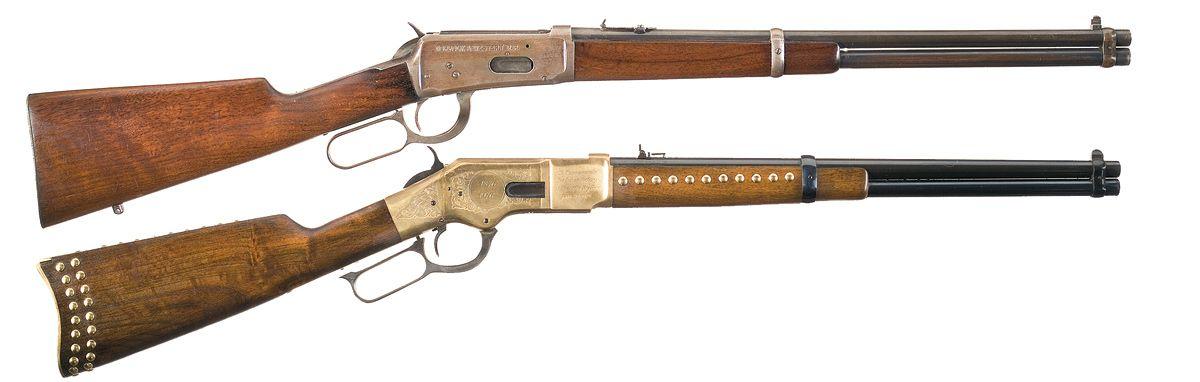 A) Made in 1901. Marble bead and folding leaf sights, standard markings, plus "NORFOLK & WESTERN R.R." spuriously engraved into the frame. Repaired forearm and straight grip stock with sling stud and a checkered buttplate.