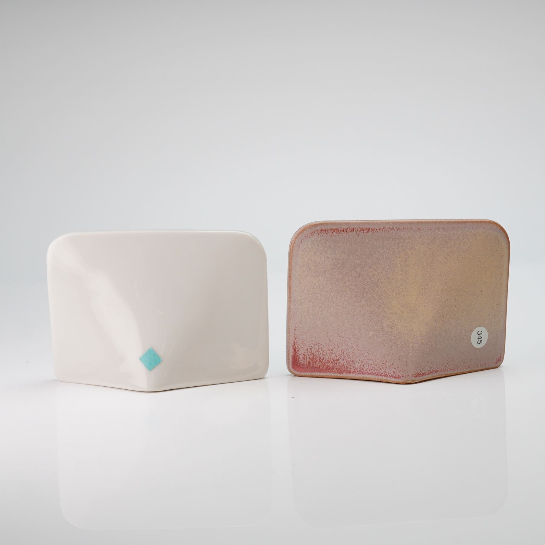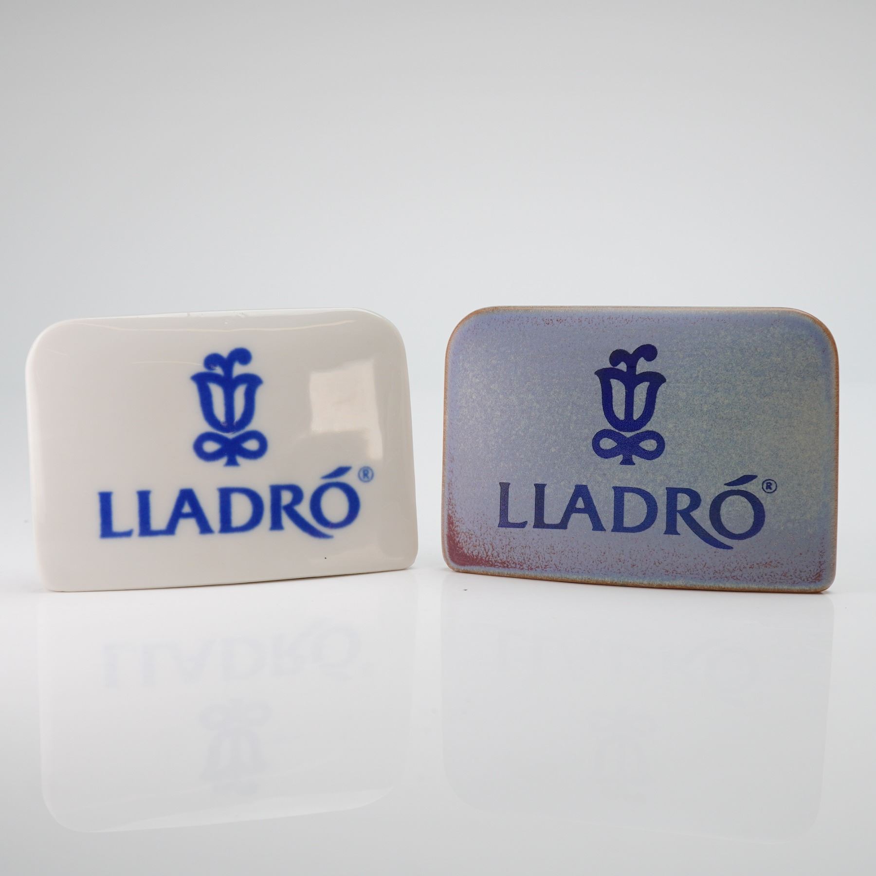 This 2pc set of Lladro display plaques is constructed of porcelain and serves as authentic dealer signage. Each plaque is designed with a rectangular form, rounded corners, and an integrated angled base for freestanding display. One plaque features a glossy white glaze, while the other shows a textured, matte grayish-blue glaze. Both pieces are decorated on the front with the blue Lladro logo and name, including a registered trademark symbol. The reverse of the white plaque bears a small blue diamond-shaped sticker, and the grayish-blue plaque bears a circular white sticker with the number 345.