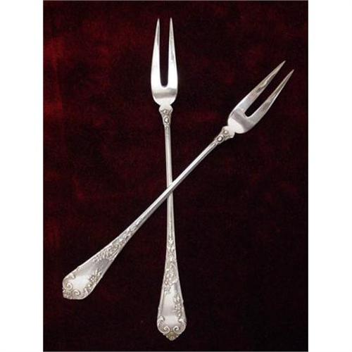 Pair of long, two-tined forks possibly pickle or other type of serving forks. Both are marked on the back of the handles with their silver content (.800) and illegible silversmith's hallmarks (see photos). They are decorated front and back as in formal French dining silverware is set with the backs facing up. In good used condition with minor signs of wear as shown. Please ask questions, request additional photos and shipping costs before buying.