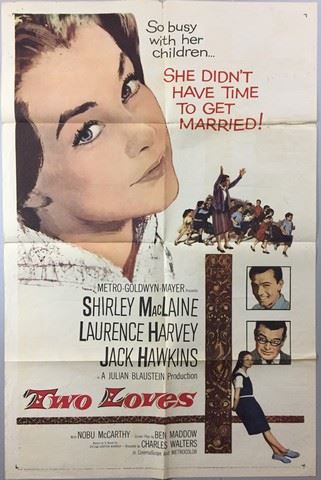 Two Loves (Julian Blaustein Productions Ltd, 1961) poster. Drama, Romance. Starring Shirley MacLaine, Laurence Harvey, Jack Hawkins, Nobu McCarthy, Ronald Long, Norah Howard, Juano Hernández. Directed by Charles Walters. Very minor edge wear, creases, small tears. Very Fine. (27"x41").