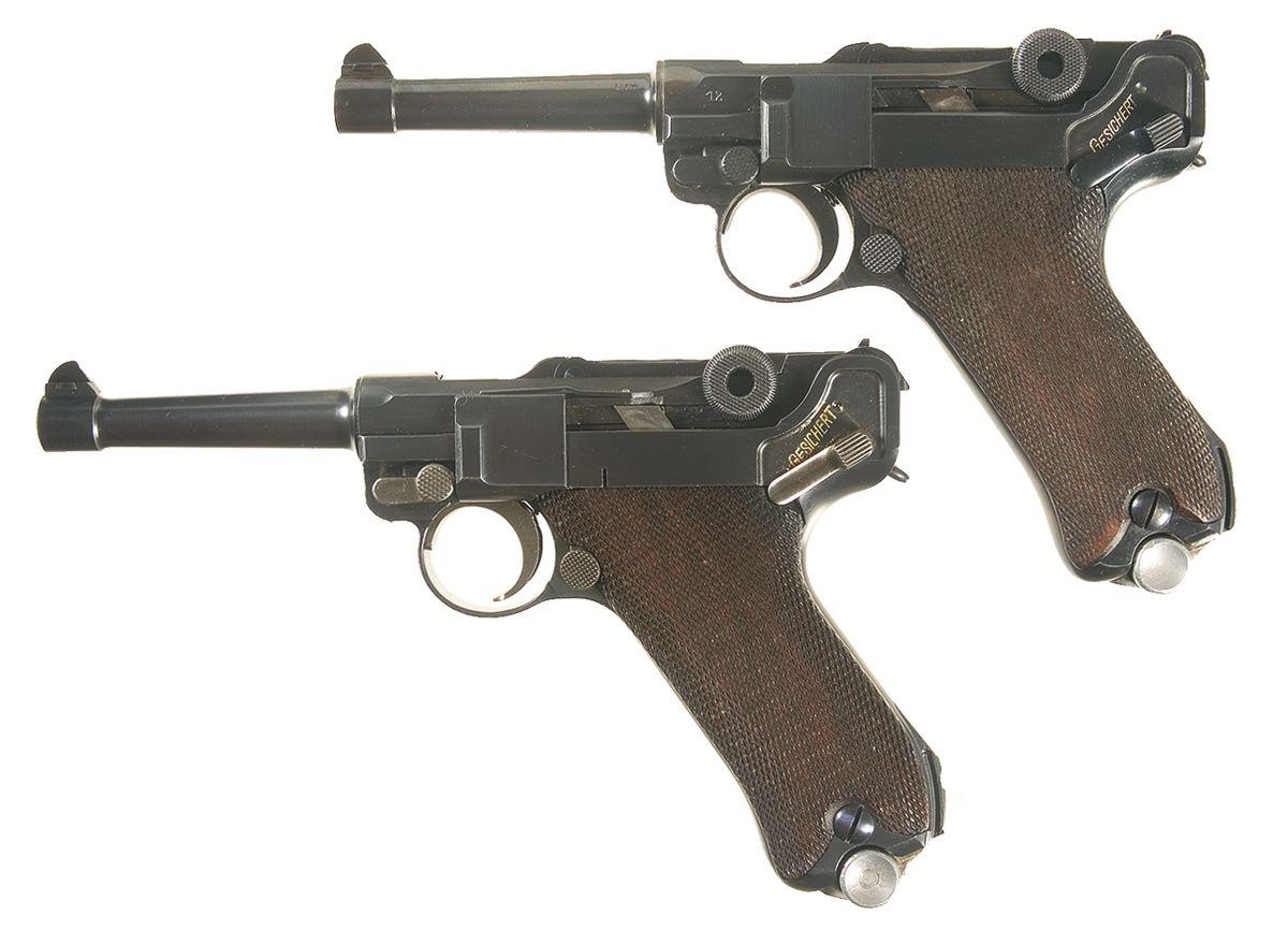 A) Early post-War rework, low serial number, fixed sights, standard chamber and toggle markings, some serial numbers removed, checkered grips.