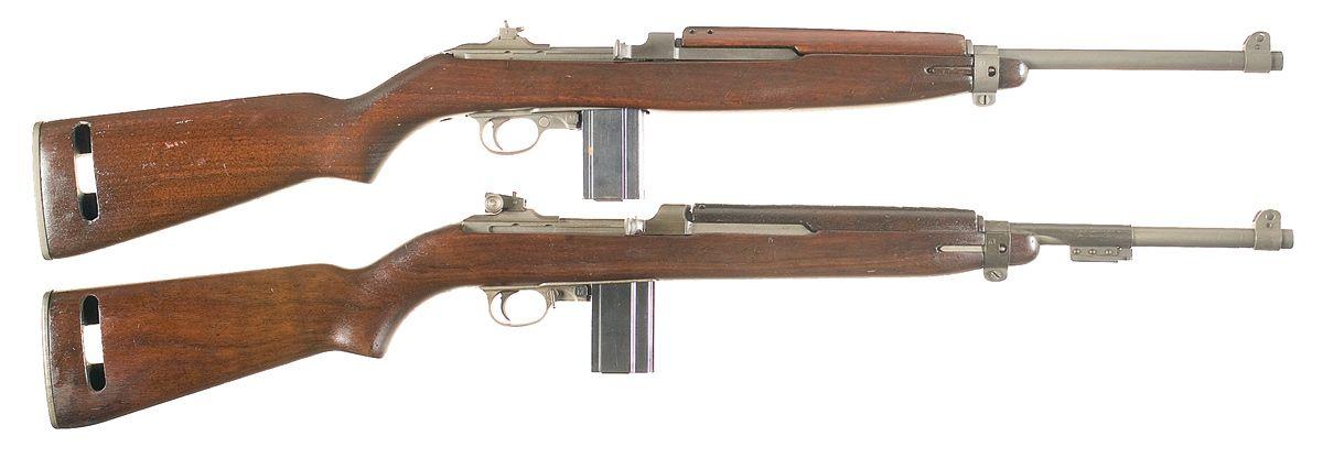 A) Mid WWII Winchester carbine, blade and 2-leaf sights, with undated barrel, Type II band, round bolt, milled trigger guard, pushbutton safety, 4-rivet handguard, low wood stock, sling swivel on the left side ahead of the cutout and a checkered buttplate.