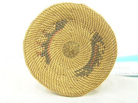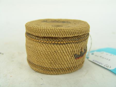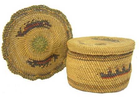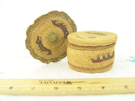 Ca. 1960s, Both very fine weave pieces, includes a lidded trinket basket, and a coaster, both with canoes and whalers. Very good condition, dusty, no missing stitches. Plaque 3-5/8", lidded 2" x 3"
