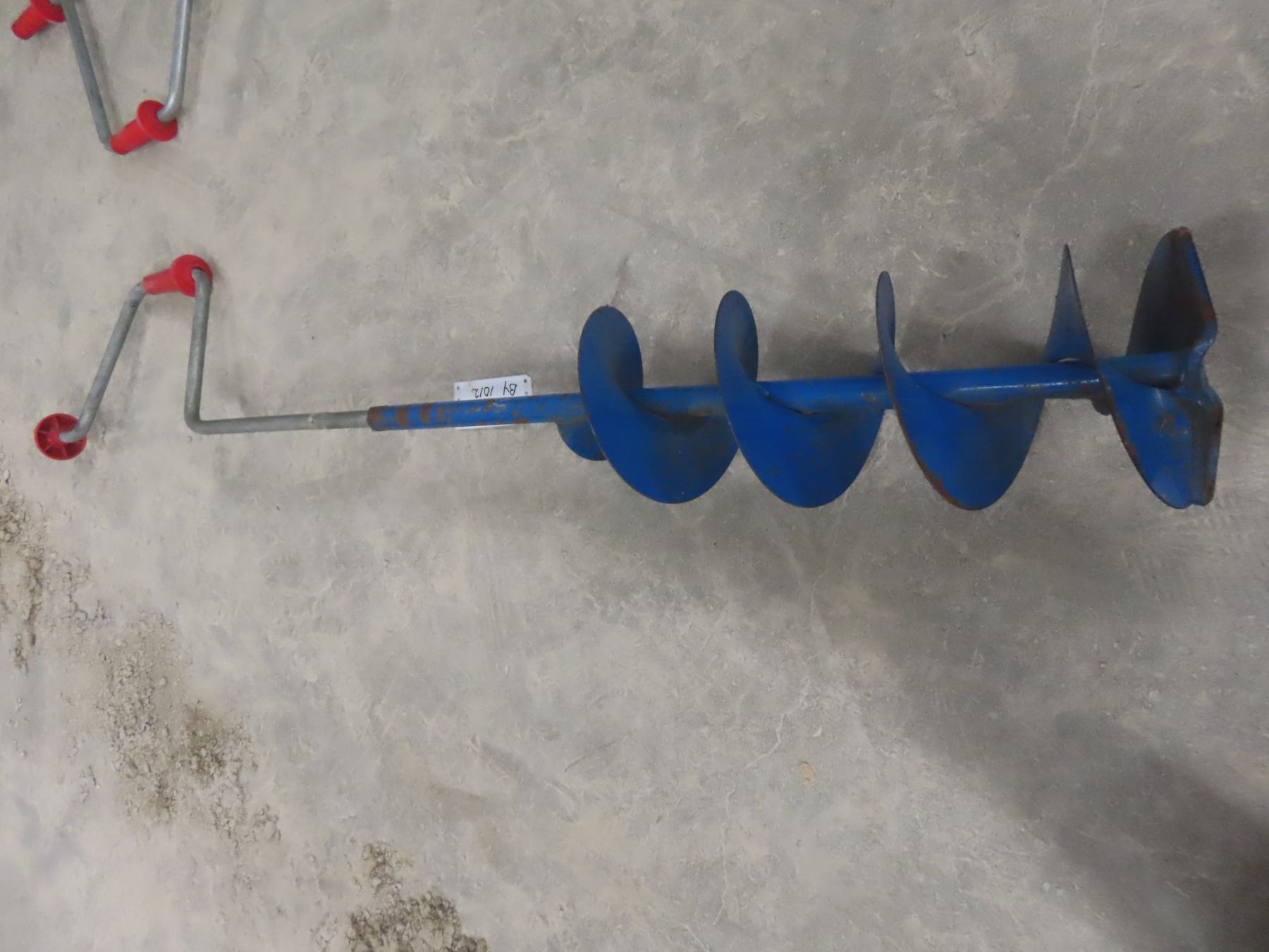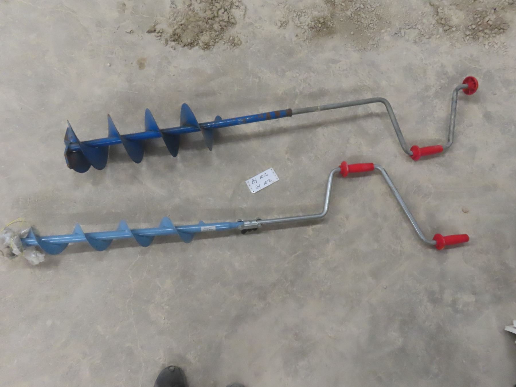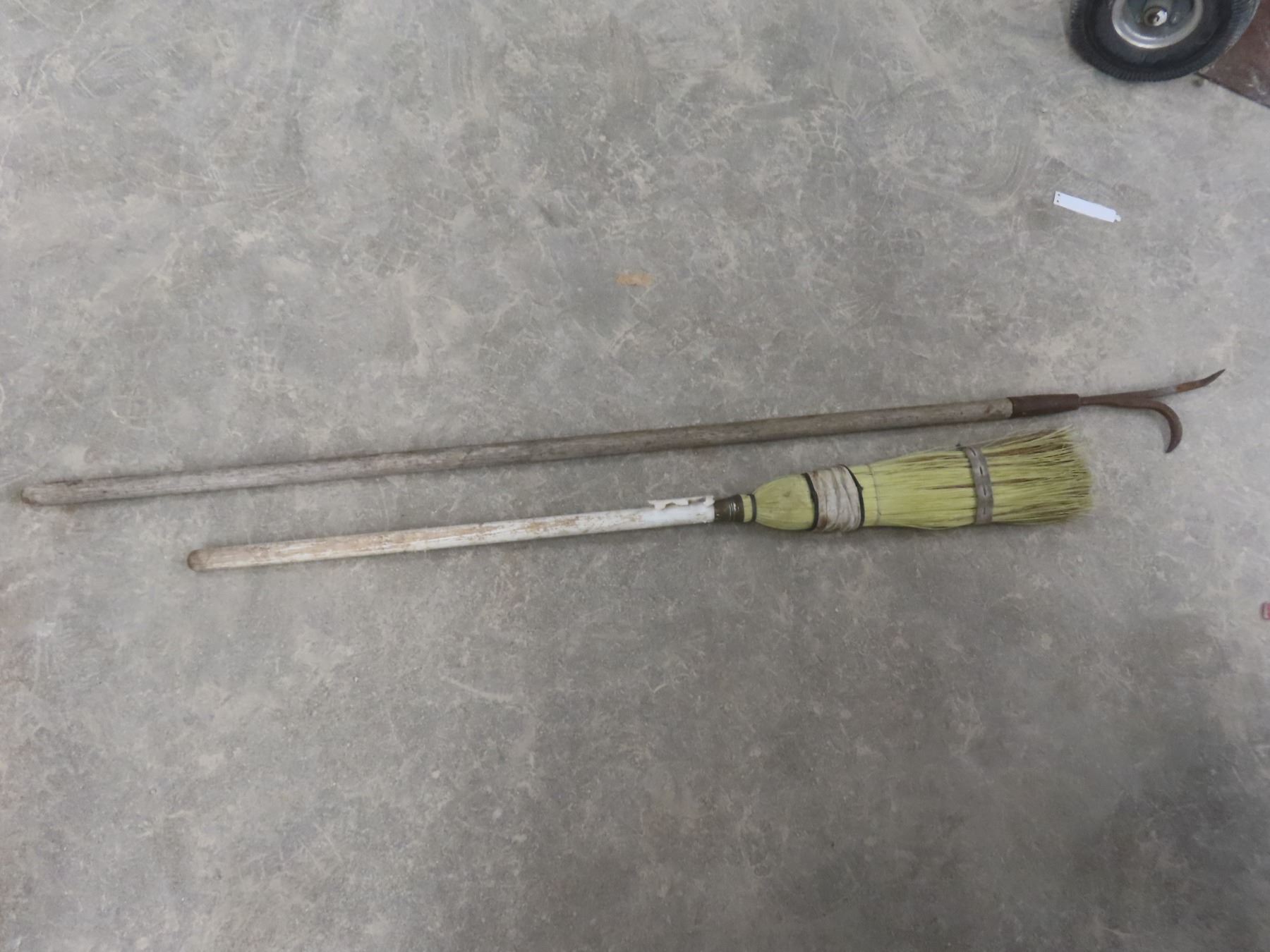 Two Manual Ice Augers (One Missing Cutting Blade), Logging Hook and Broom.
