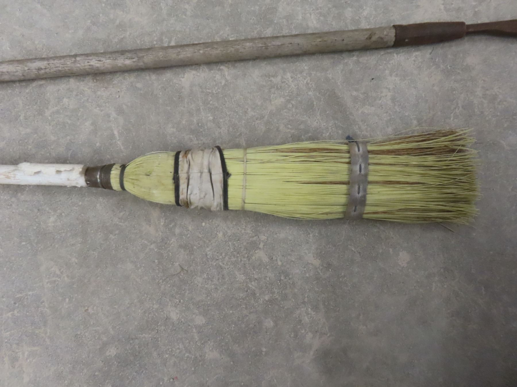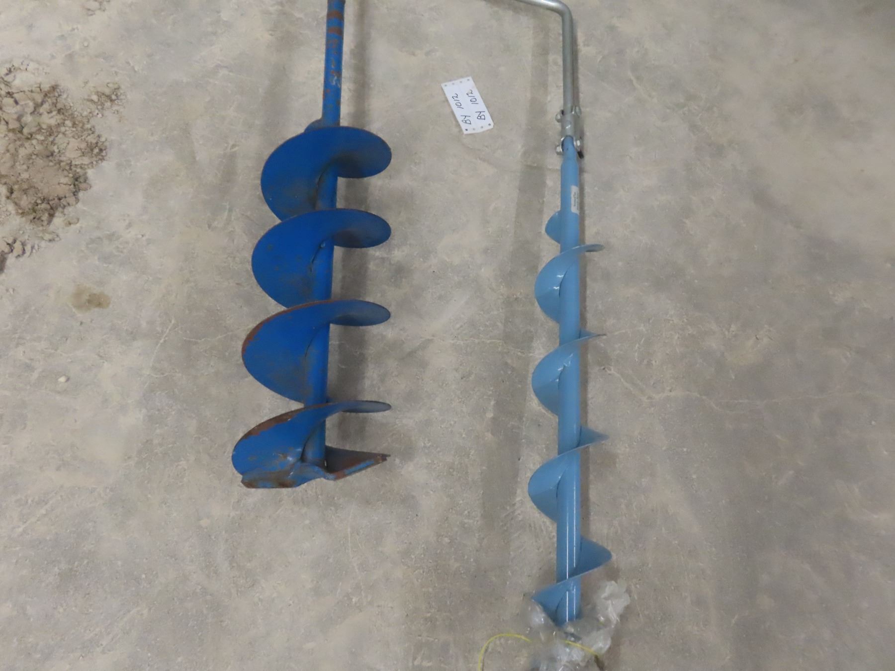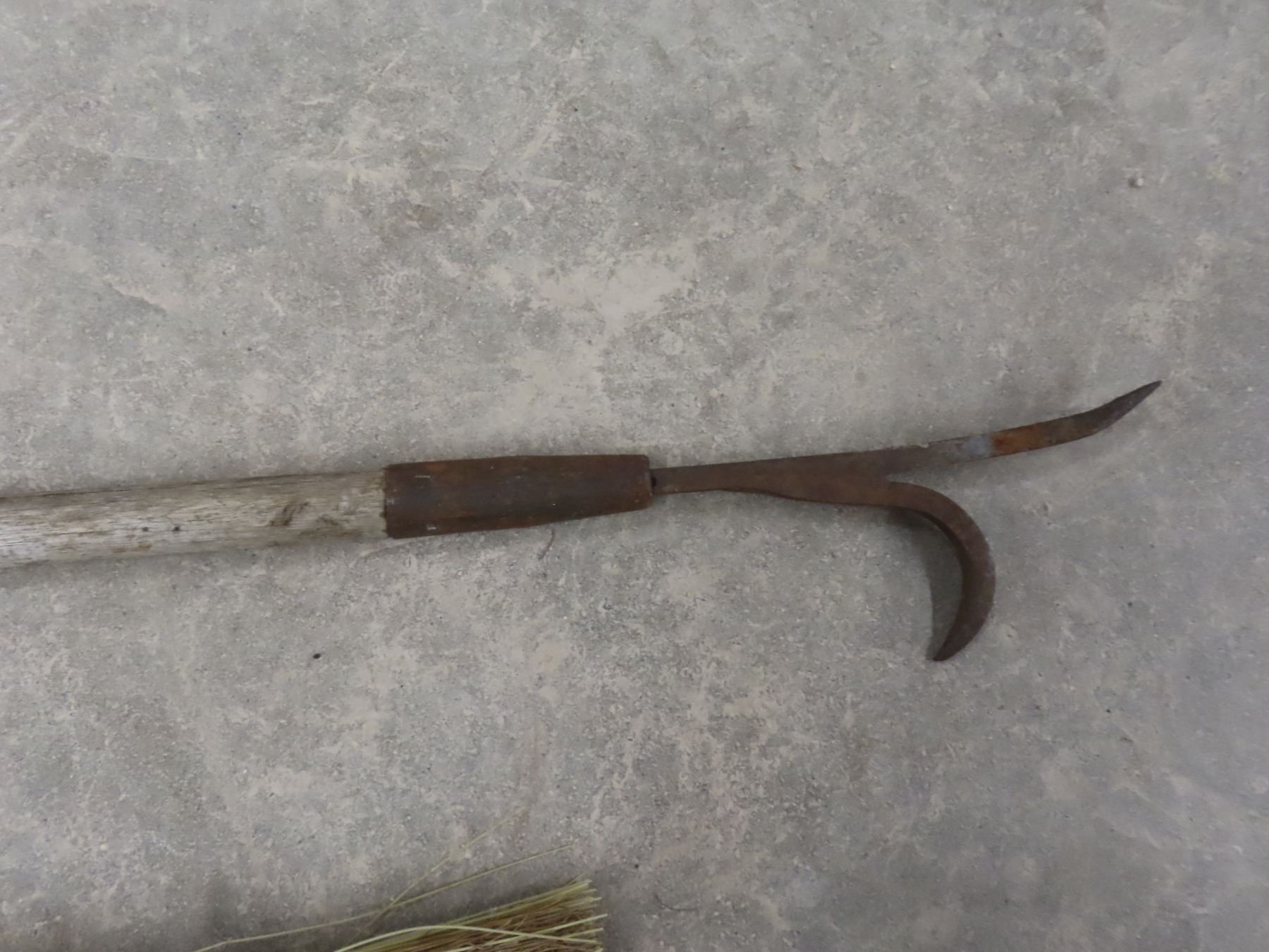 Two Manual Ice Augers (One Missing Cutting Blade), Logging Hook and Broom.