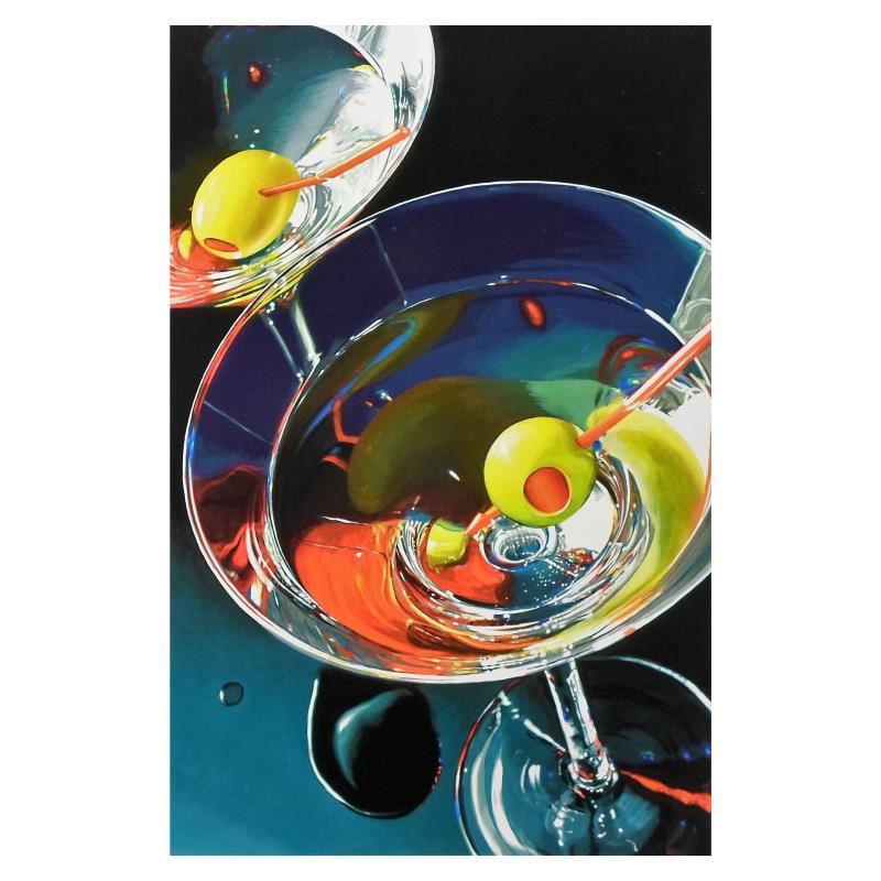 "Two Martinis" is a numbered limited edition giclee on canvas by Nobu Hairara. It comes bearing the artist's authorized signature and with a Certificate of Authenticity. Measures approximately 48"x32" (image).