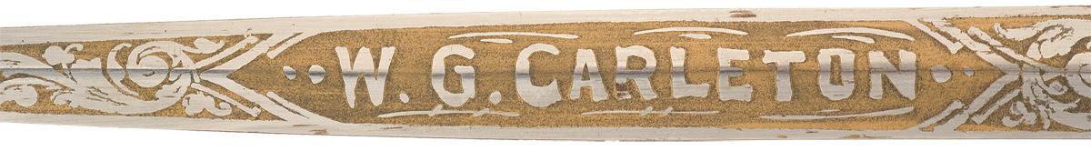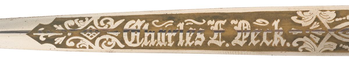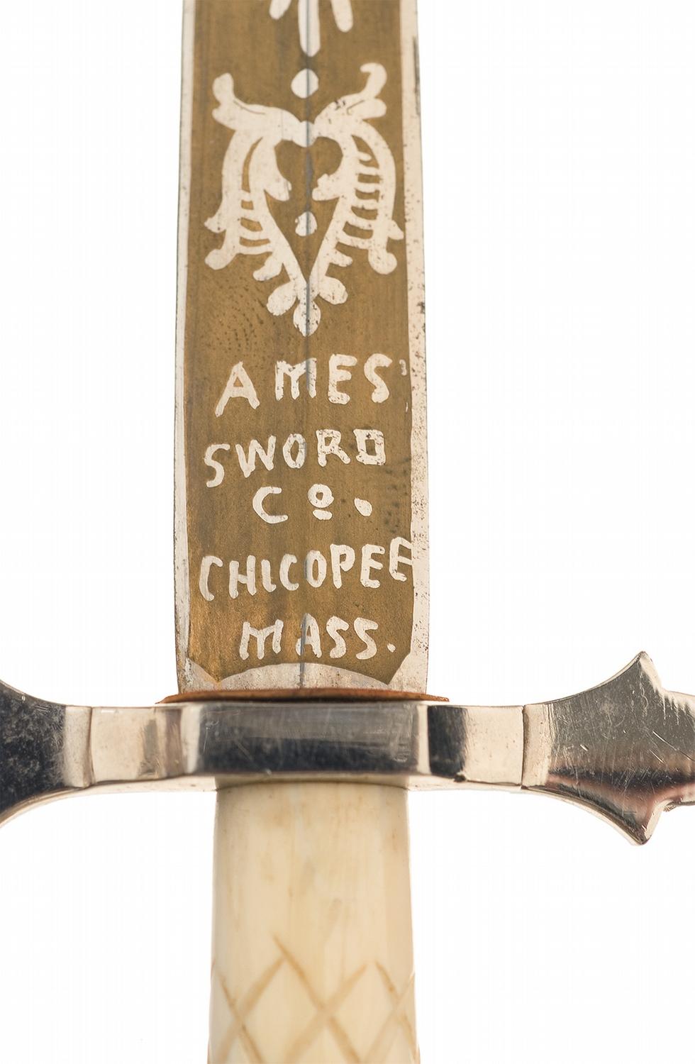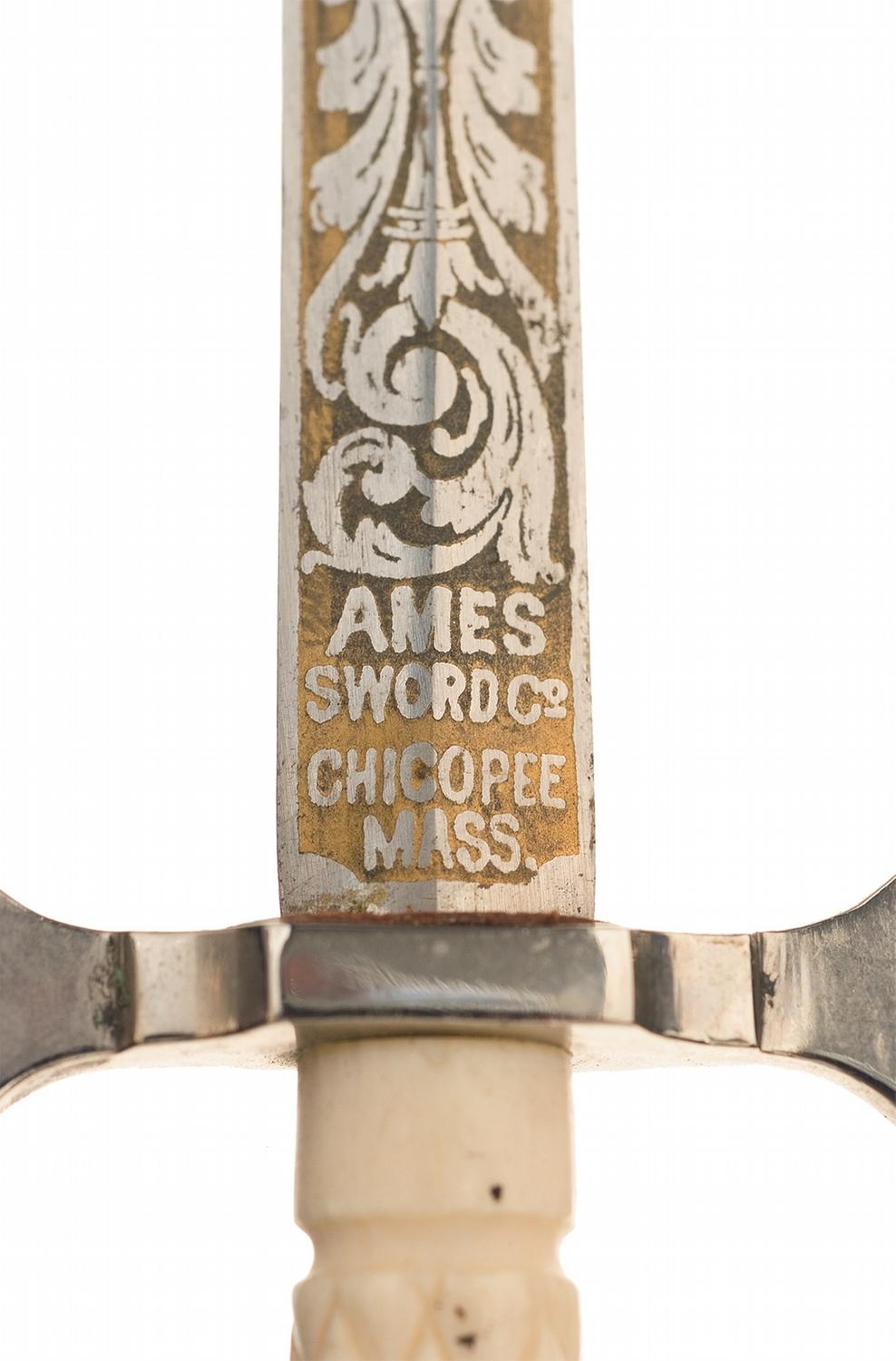 1) 5 3/4" blade etched with a scroll pattern on both sides with the Masonic crown and cross and "AMES / SWORD Co / CHICOPEE / MASS" on one side and the name "W.G. CARLETON" on the reverse. Blade has rounded point. One piece checkered ivory handle with the head of a knight as the pommel. OAL: 9 1/2". With scroll engraved sheath with a red filled cross near the throat. 2) Same handle and sheath as described in 1, but with a 5 1/2" blade etched with a simple pattern with the Masonic crown and cross and 5 line Ames address on one side and the name "Charles E. Peck" on the reverse. OAL: 9 3/8".