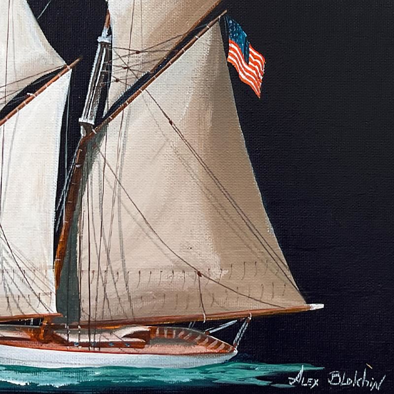 "Two Masted Schooner" is an original painting on canvas by Alex Blokhin, hand signed by the artist. Includes Letter of Authenticity. Measures approx. 12" x 16" (image).