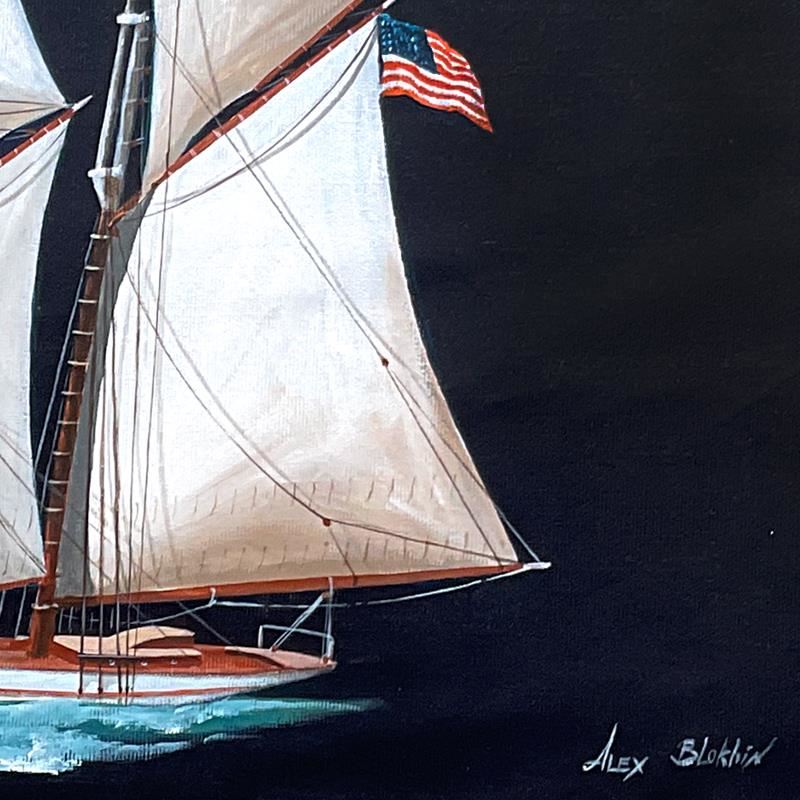 "Two Masted Schooner" is an original painting on canvas by Alex Blokhin, hand signed by the artist. Includes Letter of Authenticity. Measures approx. 20" x 24" (image).