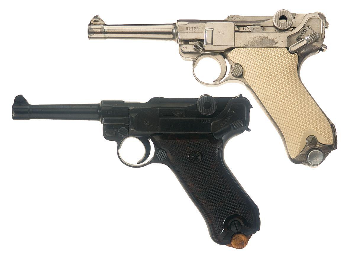 A) Standard markings and features with "42" stamped on the front toggle link and "1939" on the chamber. Complete with additional commercial magazine.