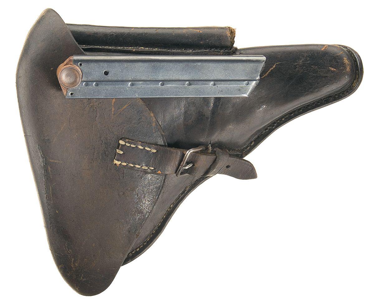 B) Standard markings and features with "42" on the chamber and Eagle "135" on the right of the receiver. Complete with a "1916" dated black leather holster and additional commercial magazine.