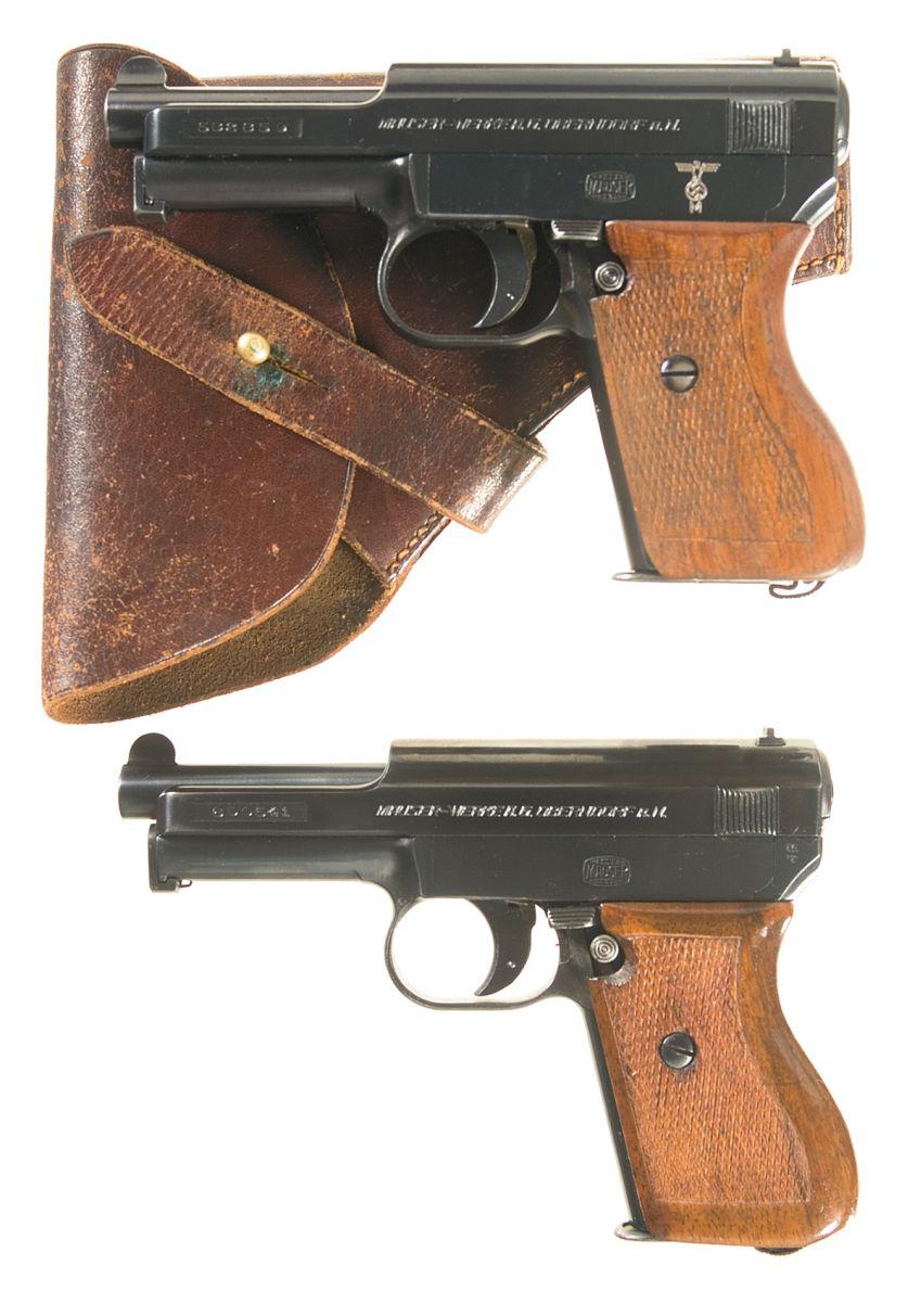 A) Made 1934-1939. Fixed sight and standard markings, with spurious "eagle/ swastika/ M" added to the side plate, "D.R.P.u.A.P." mark on the frame, matching numbers, checkered grip and brown leather flap holster.