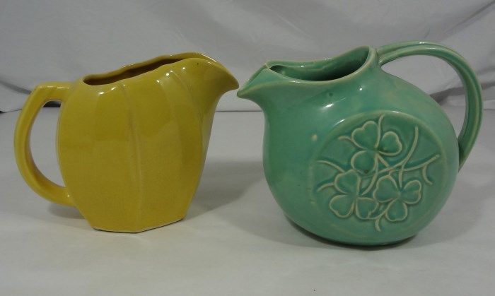 Two McCoy pitchers. One has the cloverleaf design, similar to the ones pictured in Warman's "McCoy Pottery" book. The Cloverleaf pitcher has some glazing defects from firing. The yellow pitcher has crazing. Est Value $20.00-40.00