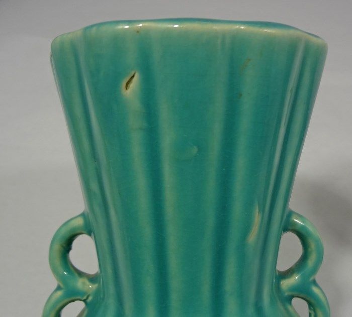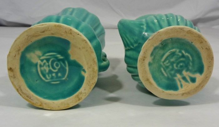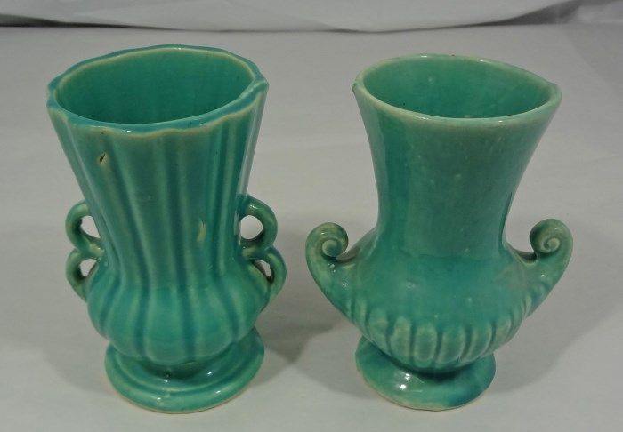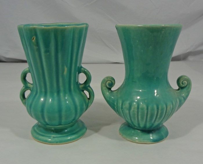 Two Vintage McCoy Vases in glossy aqua. These two pieces were found in Warman's "McCoy Pottery" book on page 238. The one piece does have two small cracks/chips from firing. Both pieces are marked McCoy USA. Est Value $60.00-80.00