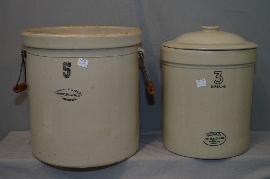 Two Medalta crocks including a five gallon and a lidded three gallon