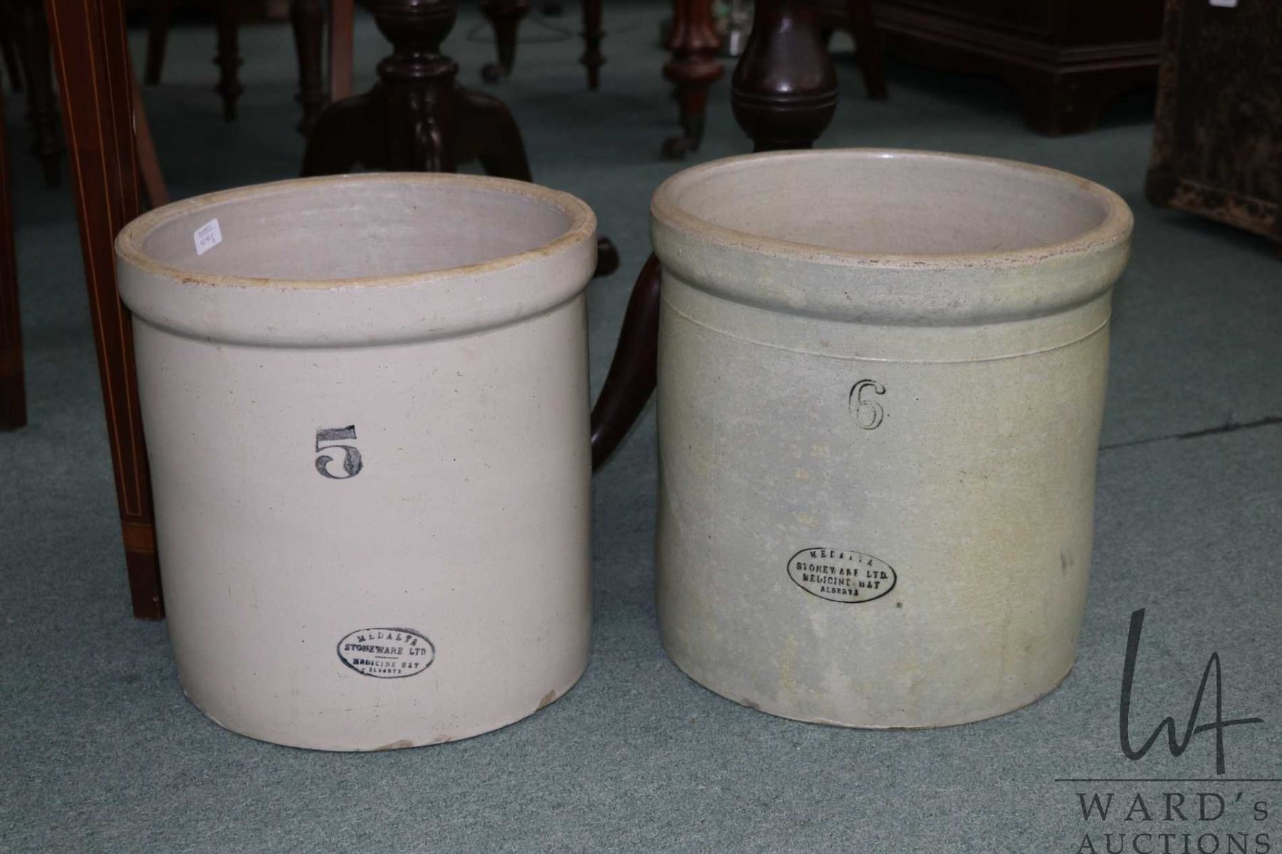 Two Medalta crocks, one five gallon and one six gallon. Note: Not available for shipping. Local pick