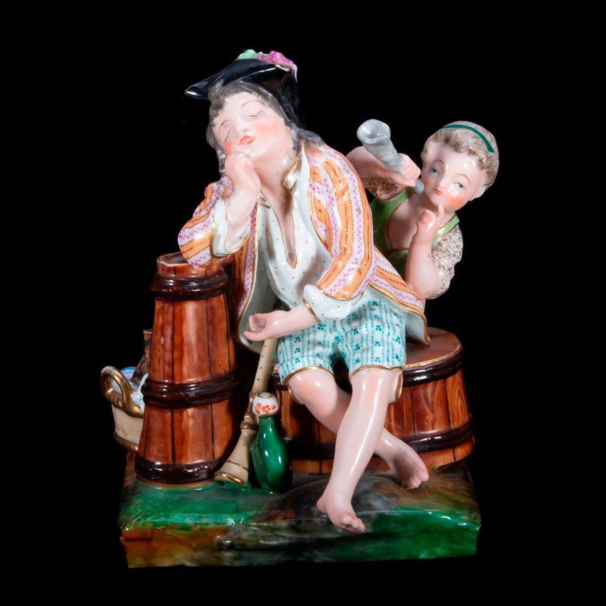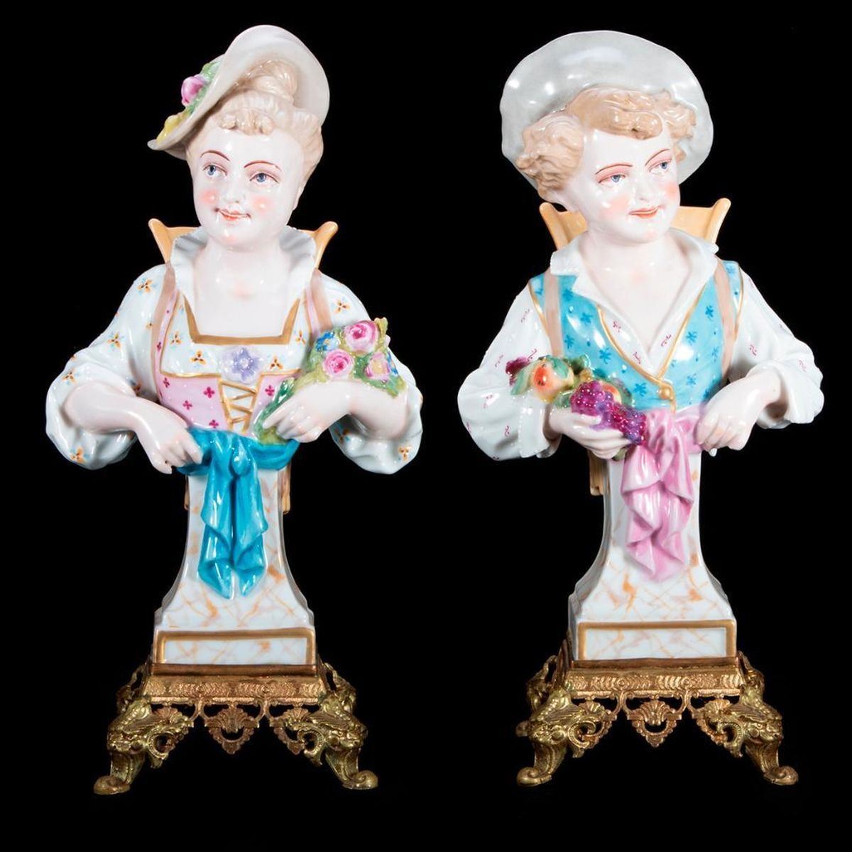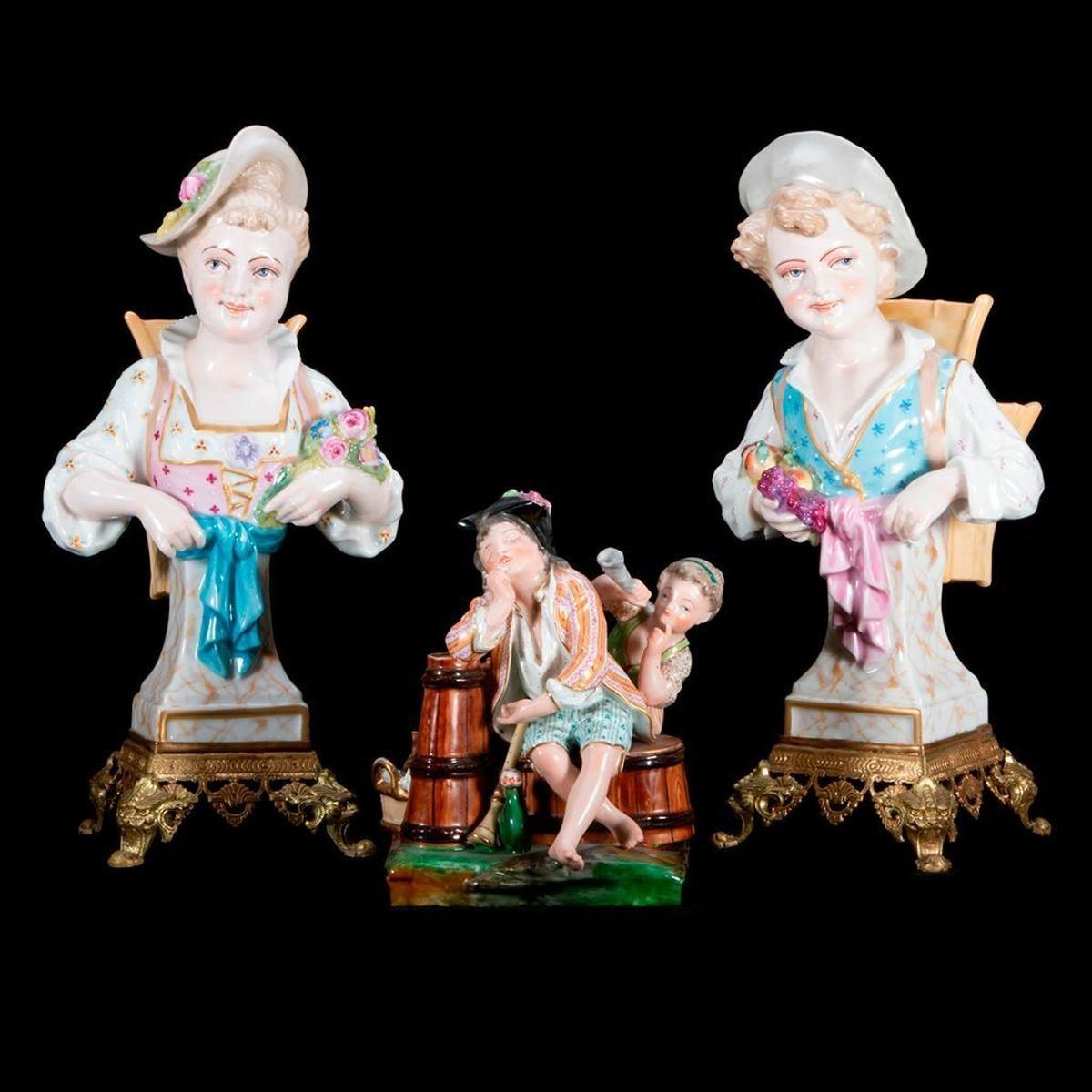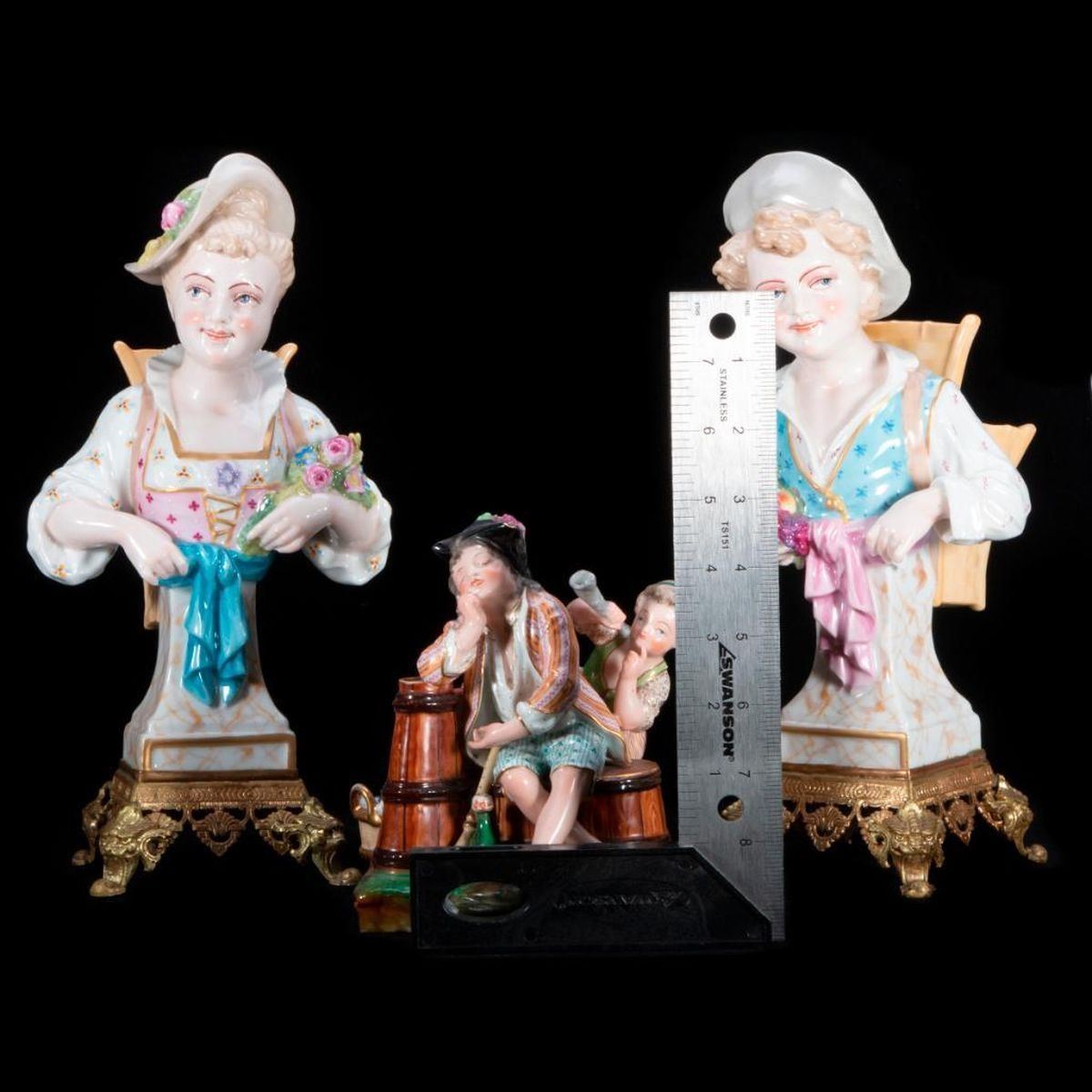 Two Continental Meissen Style Figural Groups, Young man and woman doing laundry by the river. Pair of vases worn by a boy and a girl mounted on empire style brass pedestals. Tallest, H-12", (female vase). Condition. Fair, minor loss to the basket handle, and the basket worn by the woman has been repaired.