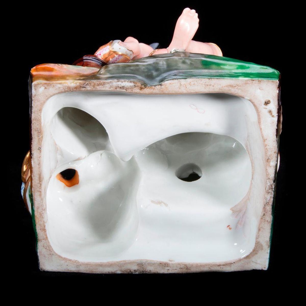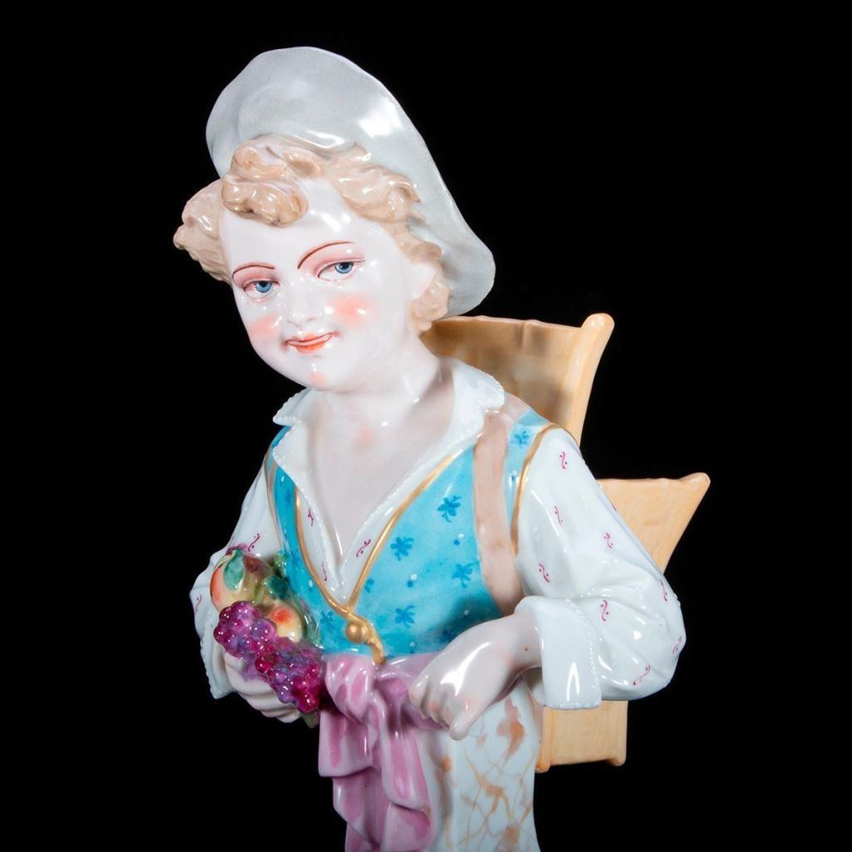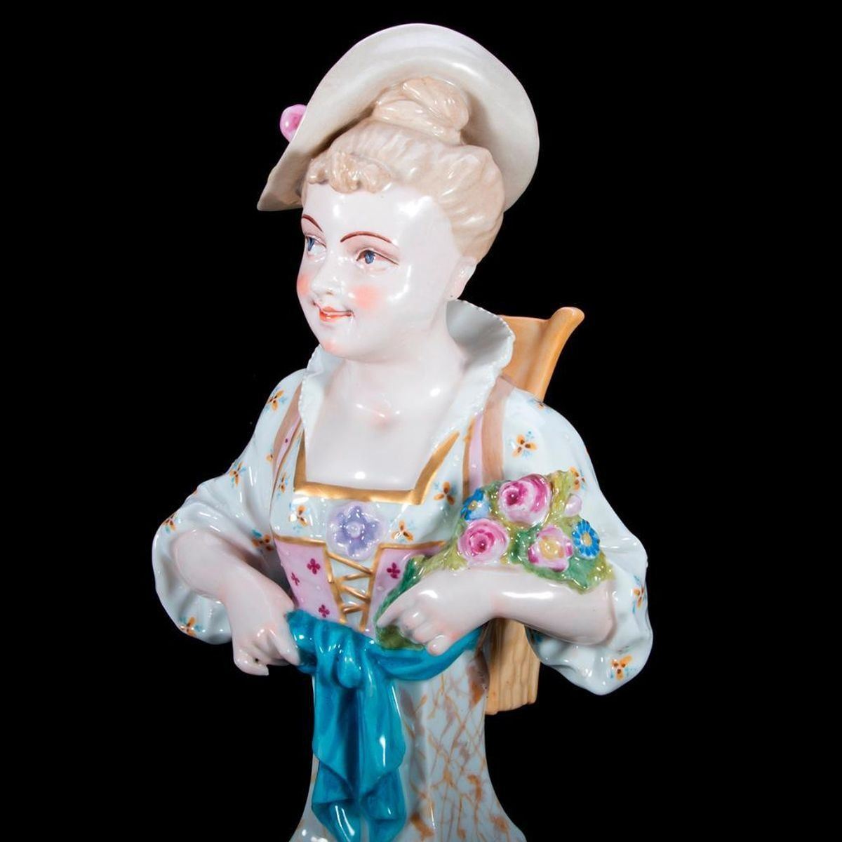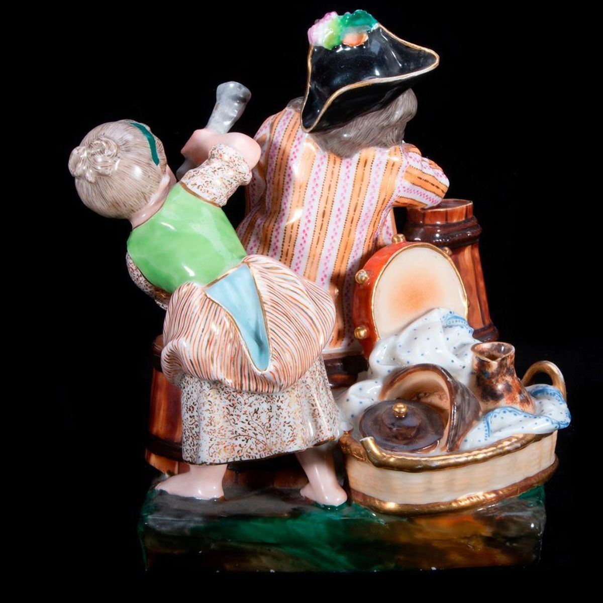 Two Continental Meissen Style Figural Groups, Young man and woman doing laundry by the river. Pair of vases worn by a boy and a girl mounted on empire style brass pedestals. Tallest, H-12", (female vase). Condition. Fair, minor loss to the basket handle, and the basket worn by the woman has been repaired.