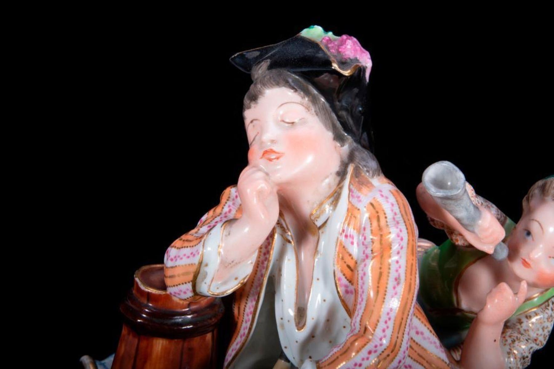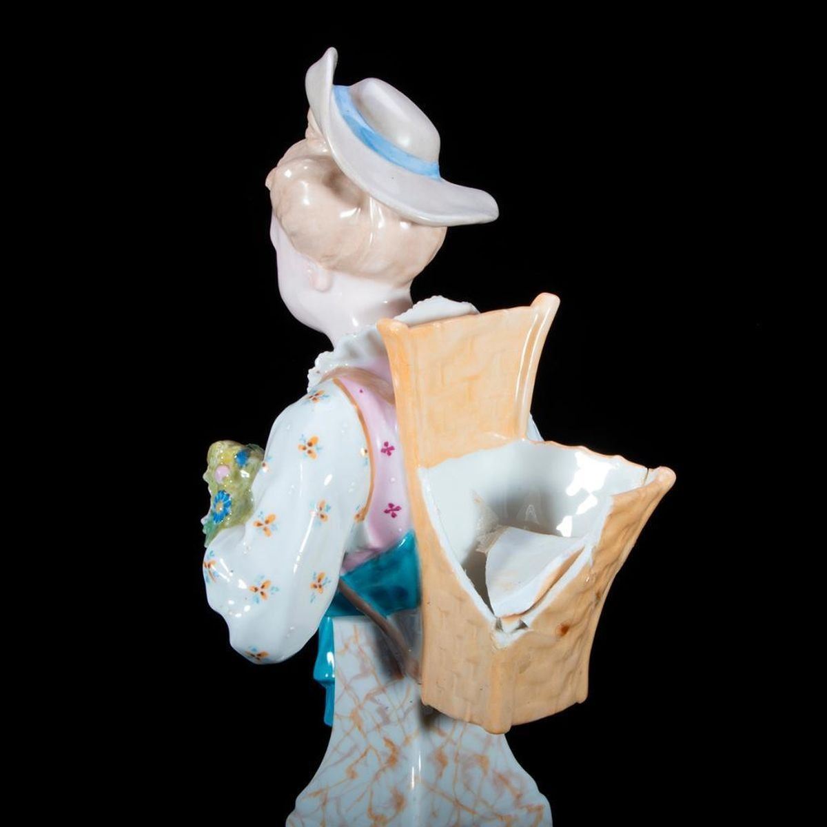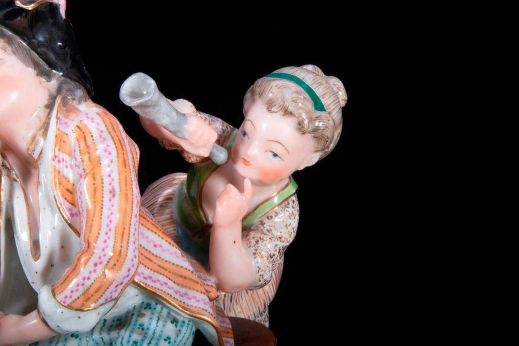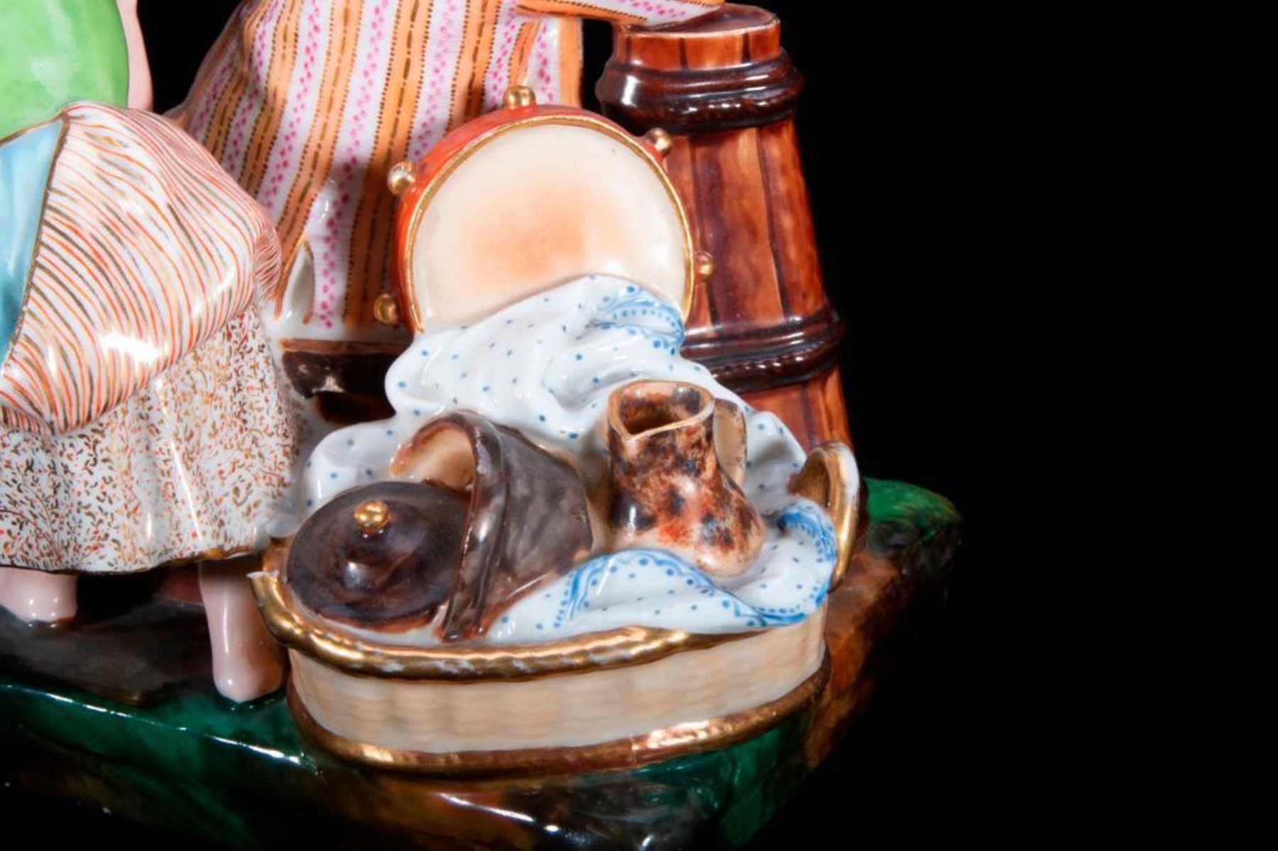 Two Continental Meissen Style Figural Groups, Young man and woman doing laundry by the river. Pair of vases worn by a boy and a girl mounted on empire style brass pedestals. Tallest, H-12", (female vase). Condition. Fair, minor loss to the basket handle, and the basket worn by the woman has been repaired.