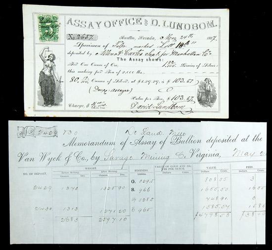 Two Memorandums: One of Silver Bullion- David Lundbom, Assayer One of Gold and Silver-Van Wyck & Co.