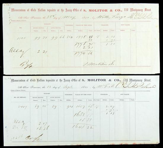 Two Memorandums of Gold Bullion- Molitor& Co.-Assayers. 1…99 oz totalling $1774.51 deposited by Wells Fargo at the assay office of S. Molitor & Co, May 25, 1860.