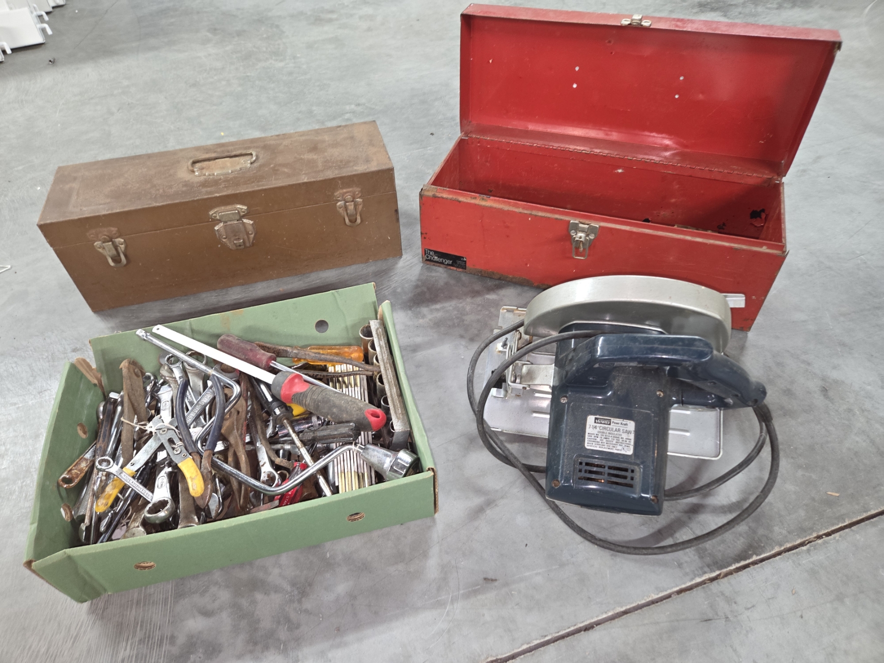 Two Metal Tool Boxes, Assorted Quality Tools, And Saw
