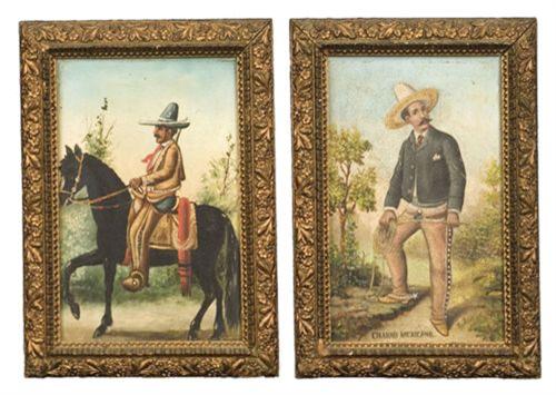 Two Mexican Folk Paintings. 7" x 9 ¾”. Oil on Board. c. 1880s. One shows Mexican Rurale on horseback. One is titled "Charro Mexicano". Both signed. (est $2,000-3,000)