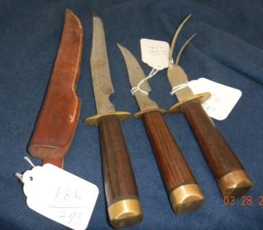 The two knives and the one fork all match made by Bison.  The knives measure 14 1/2 by 1 inch, 10 1/2 x 1 inch and the fork is 10 inches by 1 inch.  The larger knife has a leather scabbard.  Condition all items are very good.  Shipping $20.00