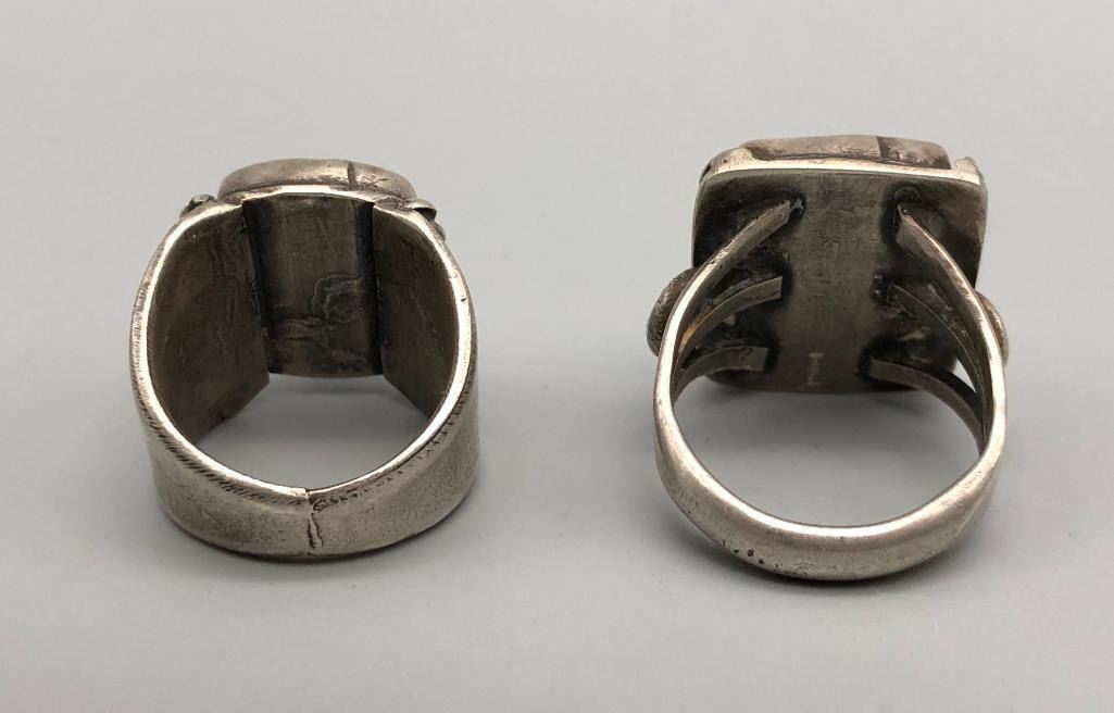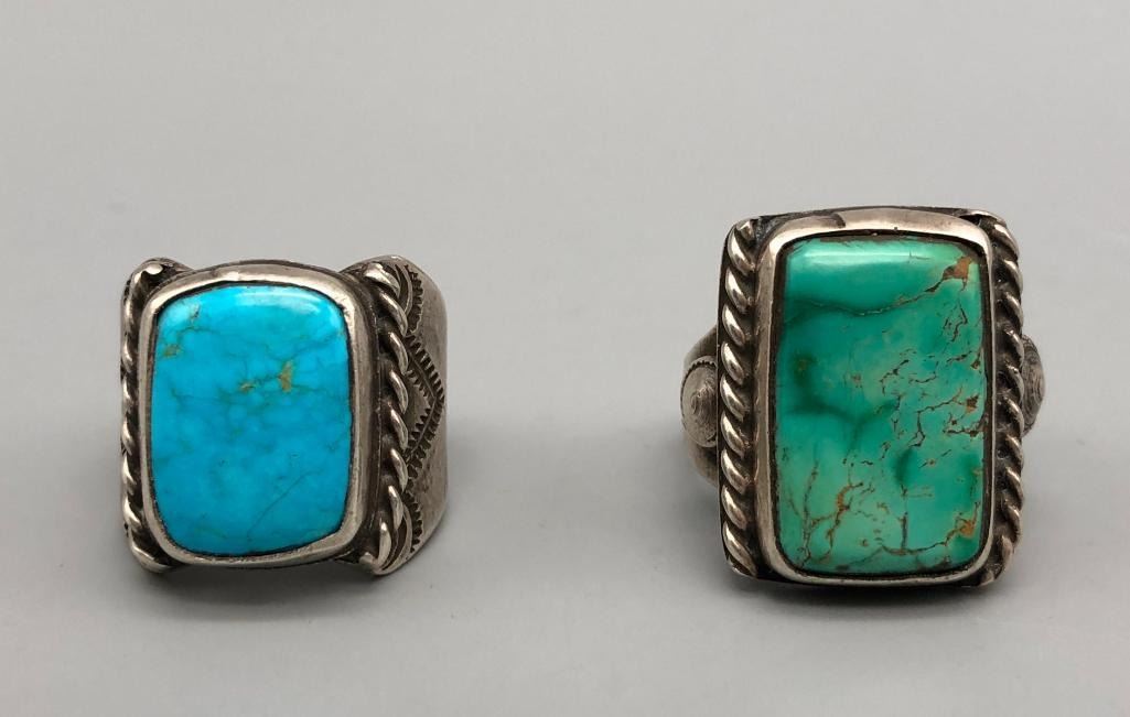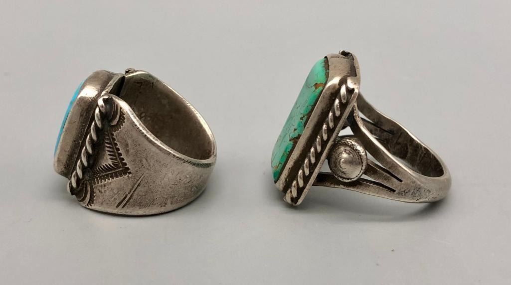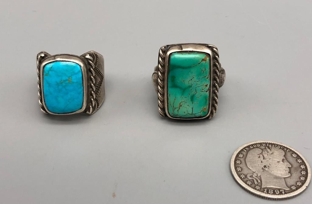 Up for consideration are two mid century turquoise rings. Both are nice older rings set with older turquoise stones. Each have nice bands one has a split style and the other is thicker with hand stamped designs. Both are made from sterling silver. MAKER: Unmarked. APPROX AGE: Circa Mid Century. SIZE: 11.5 and 10. Measure 7/8 inches to 1 inch wide. Weighs 38.4 grams. CONDITION: Good for their age, normal wear expected. Please look closely at the pictures as they are an important part of our description and are hereby incorporated into the description, specifically with regards to condition. SHIPPING: There will be a $5 handling / packaging fee for shipping this lot. The actual cost of postage will be added on top of that. BUY IT NOW: If you would like to buy this item now, without waiting for the auction day to bid on it, we do offer this option (which is available up to 48 hours before the actual auction starts). The “Buy it Now†price is the high estimate of this lot (plus applicable fees and the Buyer's premium is discounted to 10% when using the Buy it Now option). If you would like to exercise this option, you must contact us by email (or phone as long as you talk to someone live). Reference this lot number and your intention to "Buy it Now."