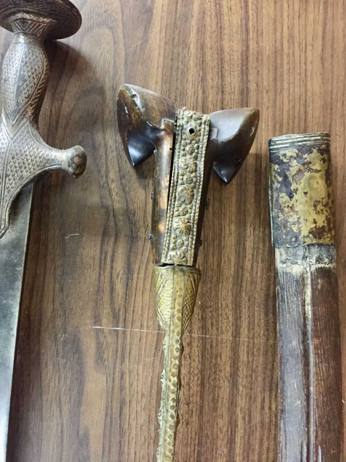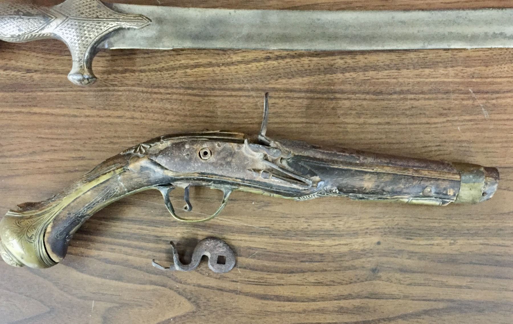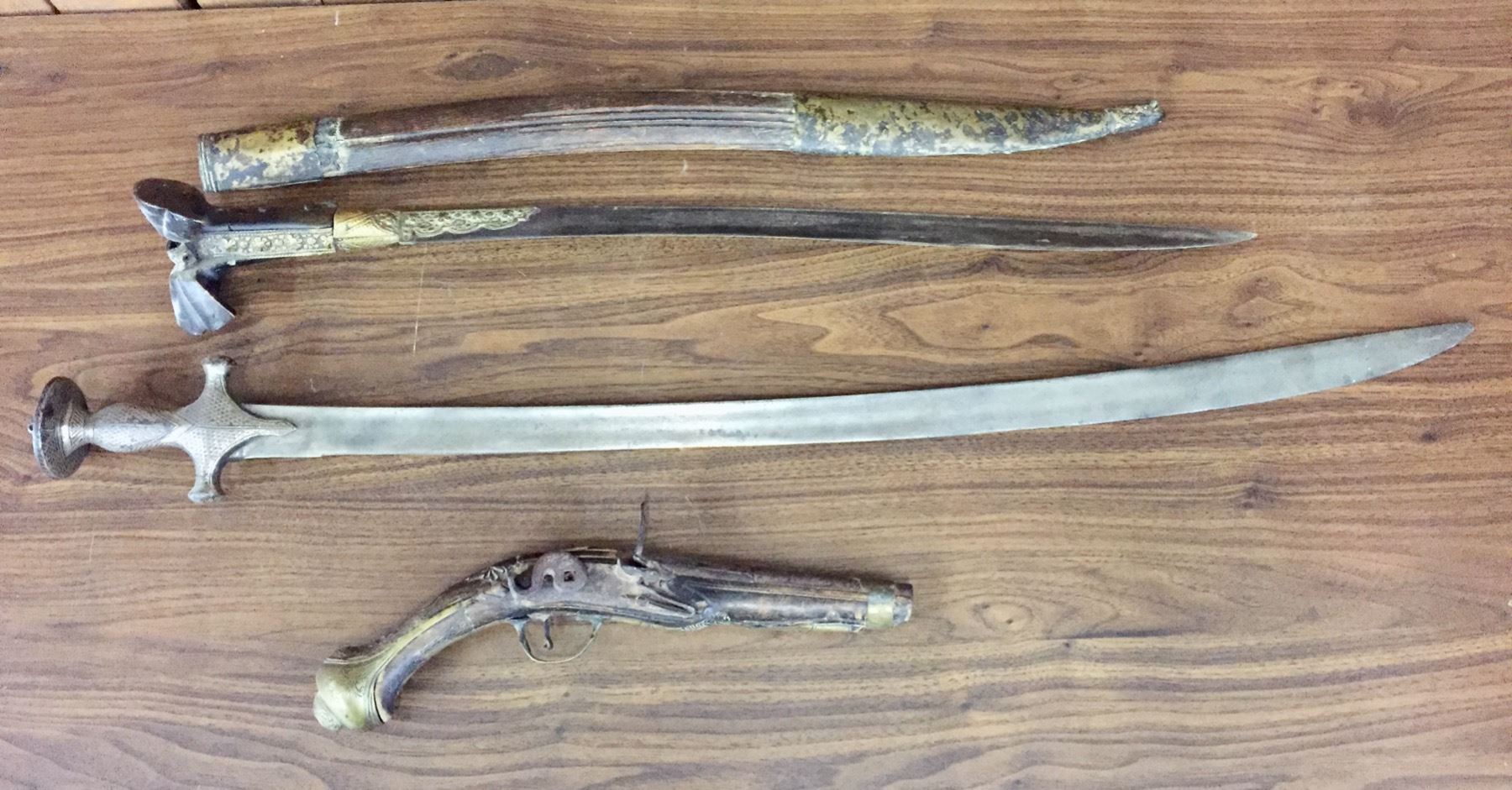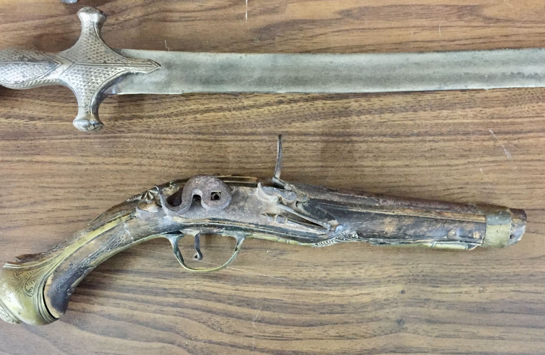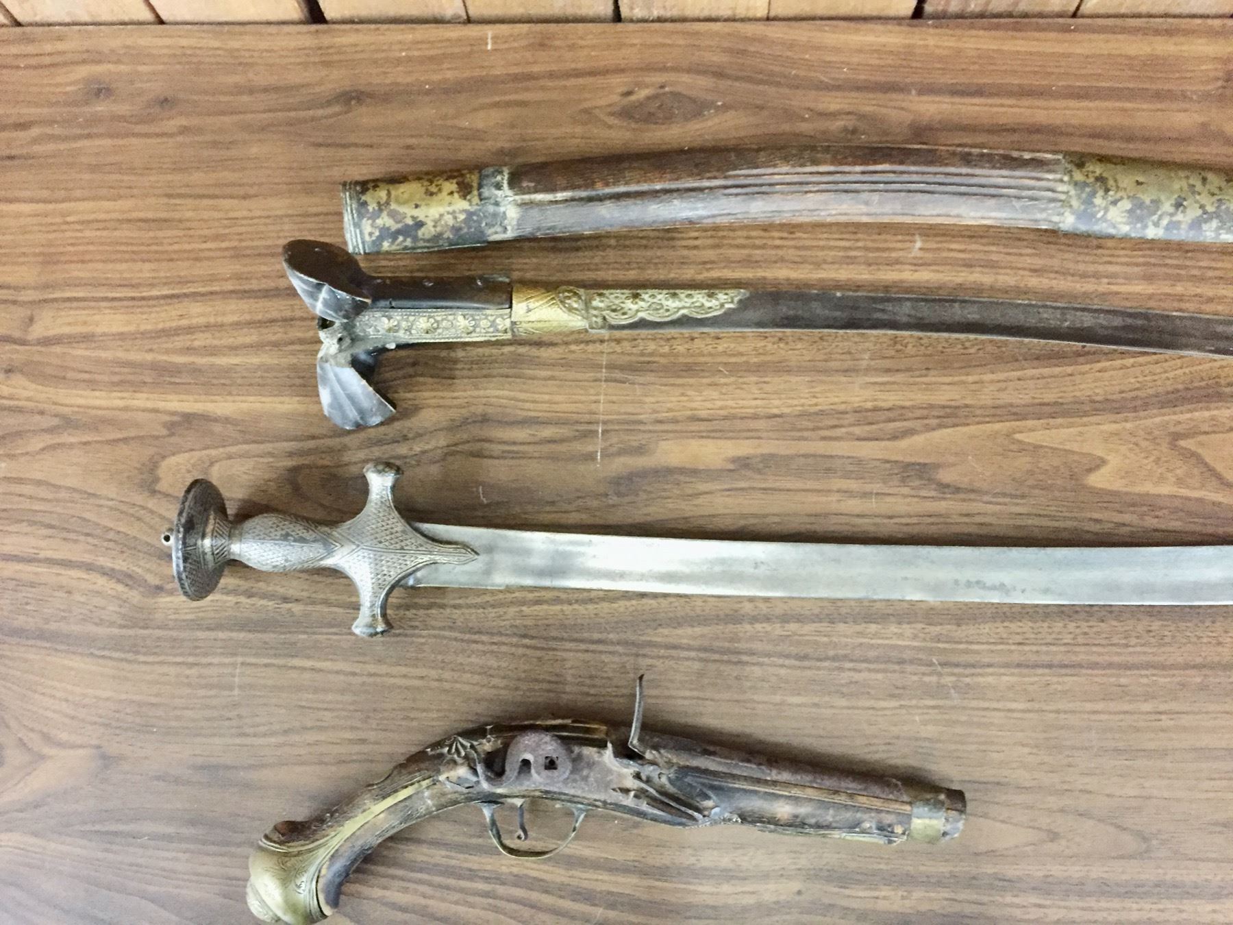 Description: Included for sale in this lot are two middle eastern swords and an engraved antique flintlock pistol. Maker: All are Middle Eastern. Approx. Age: Antiques. Size: 4 inches wide x 35 inches long, 4 inches wide x 30-1/2 inches long. Pistol measures 13-1/2 inches long. Condition: Fair to poor for their ages. They are for display at this point. Please look closely at the pictures - they are an important part of our description. Shipping: There will be a $15 handling, packaging fee for shipping this lot. The actual cost of postage will be added on top of that. *****ANTIQUE - This firearm DOES NOT REQUIRE an FFL Transfer*****