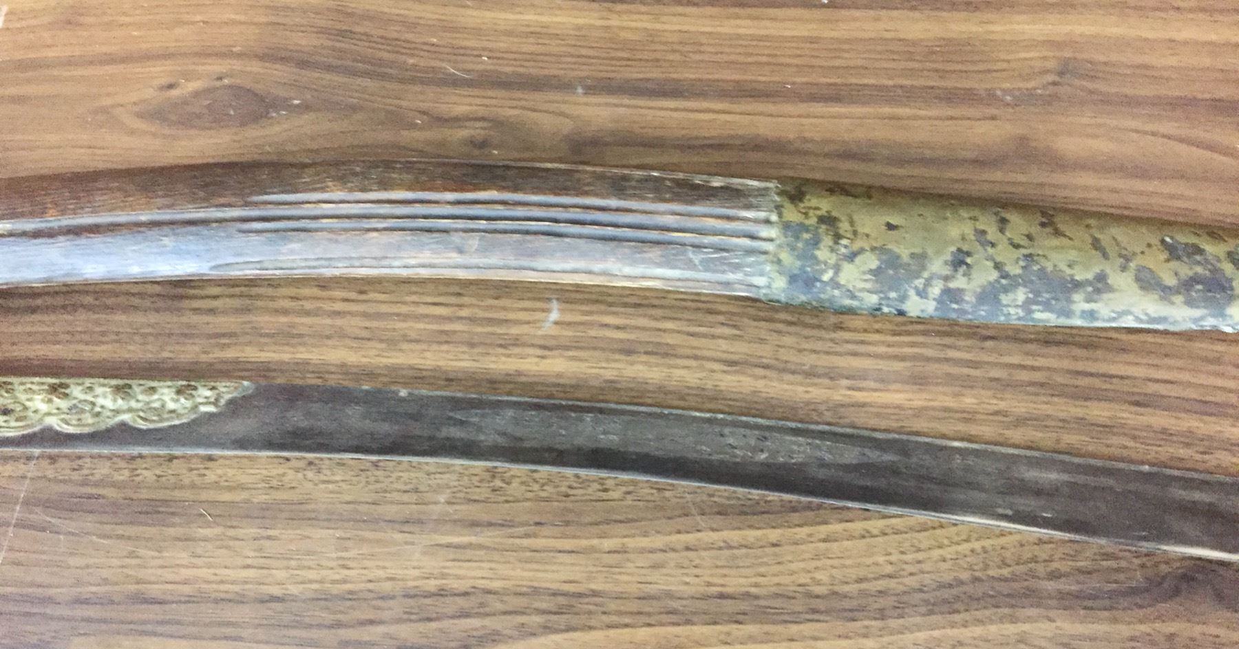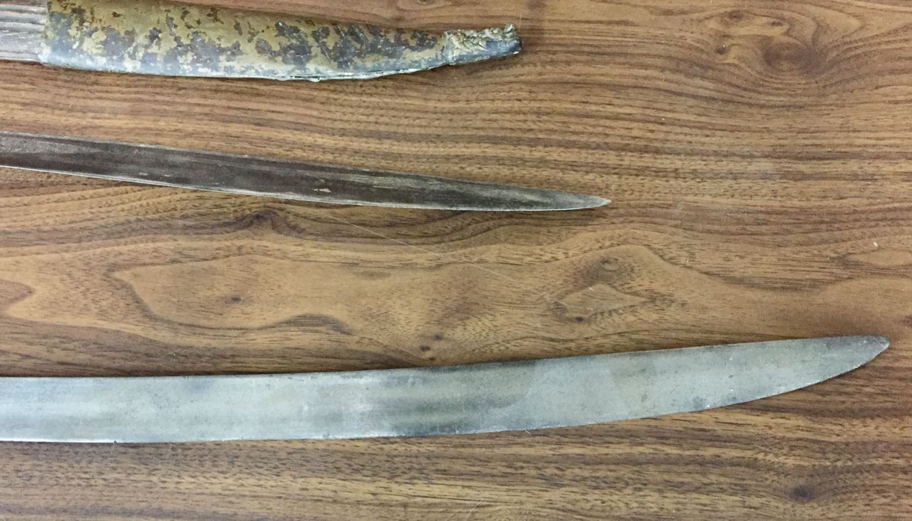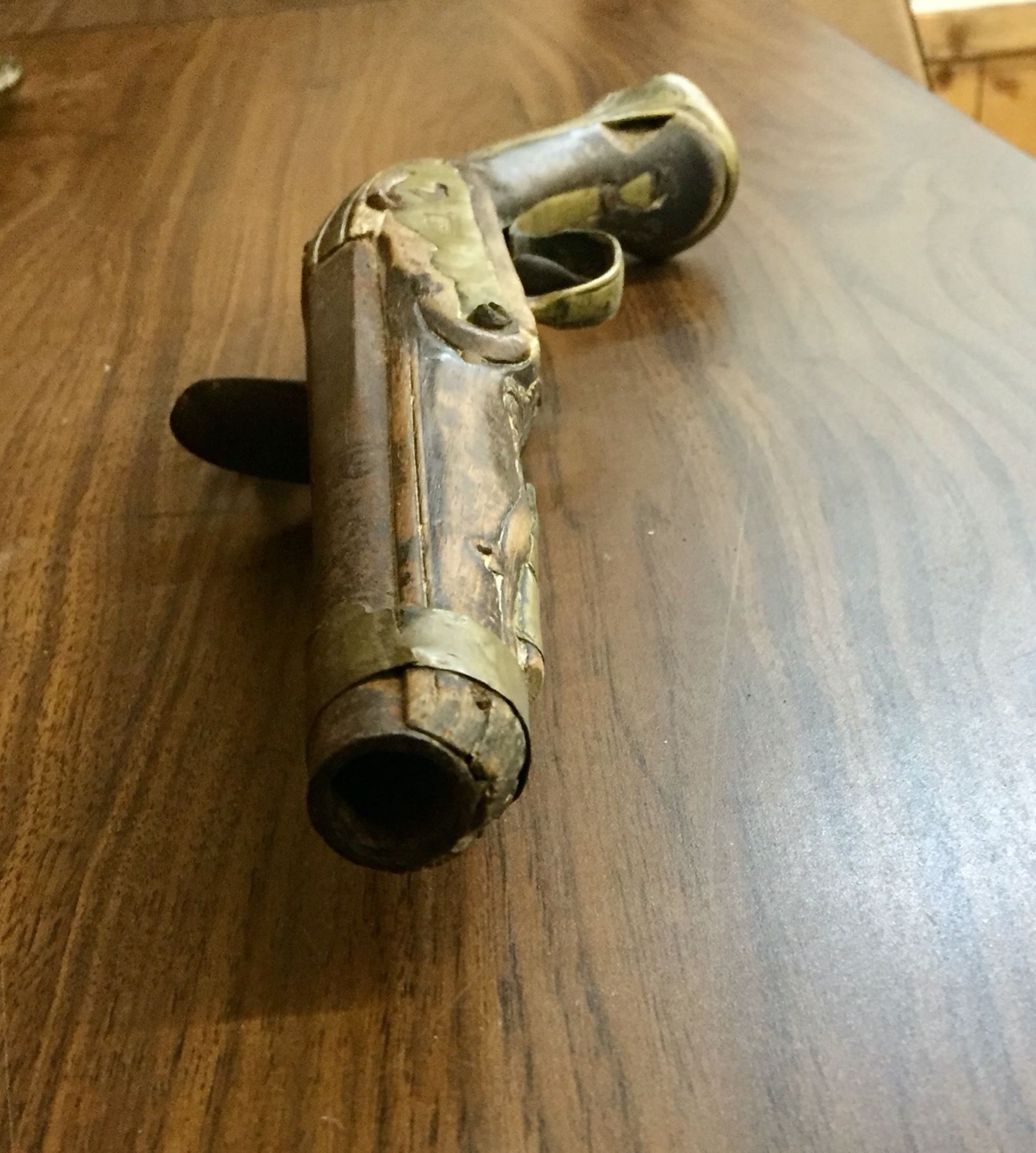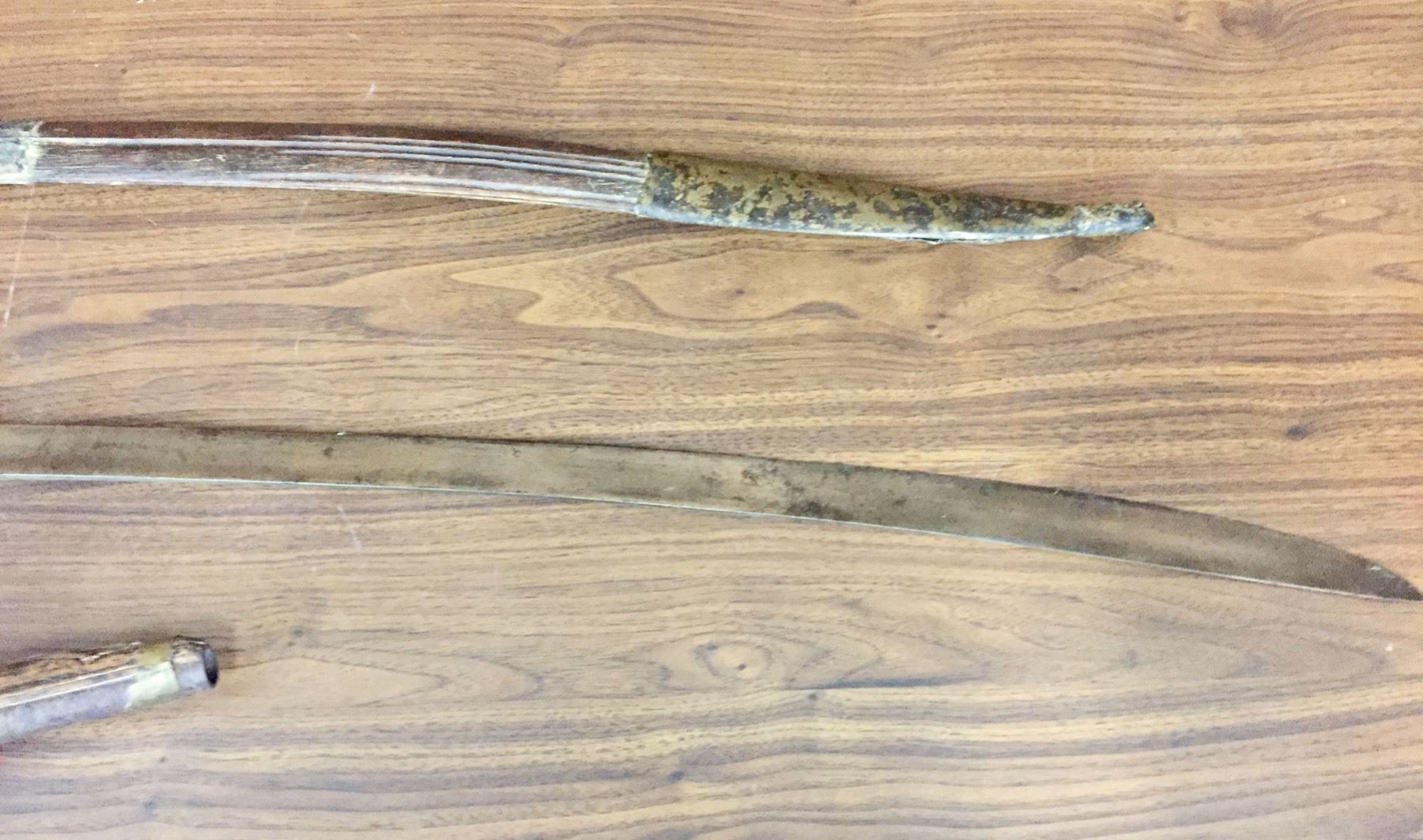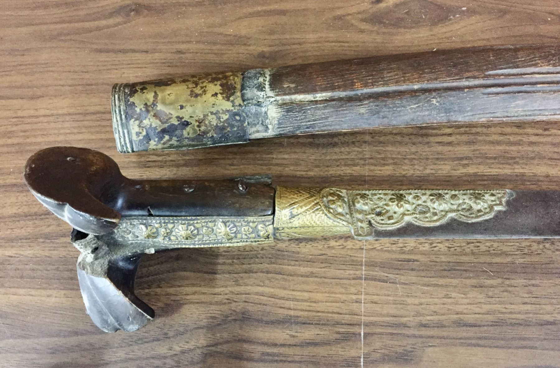 Description: Included for sale in this lot are two middle eastern swords and an engraved antique flintlock pistol. Maker: All are Middle Eastern. Approx. Age: Antiques. Size: 4 inches wide x 35 inches long, 4 inches wide x 30-1/2 inches long. Pistol measures 13-1/2 inches long. Condition: Fair to poor for their ages. They are for display at this point. Please look closely at the pictures - they are an important part of our description. Shipping: There will be a $15 handling, packaging fee for shipping this lot. The actual cost of postage will be added on top of that. *****ANTIQUE - This firearm DOES NOT REQUIRE an FFL Transfer*****