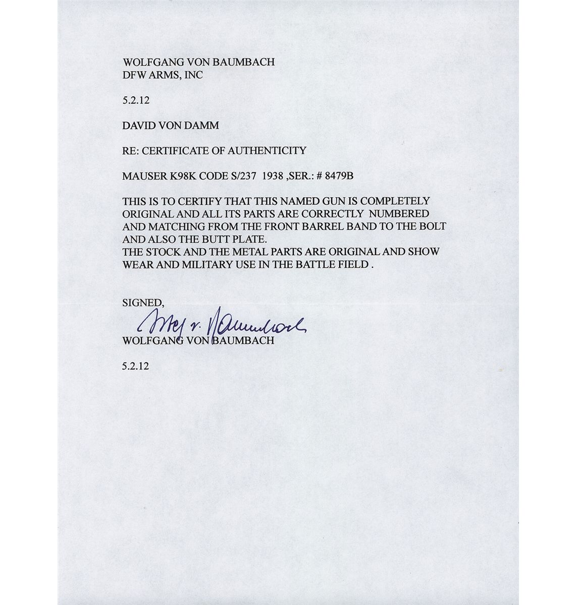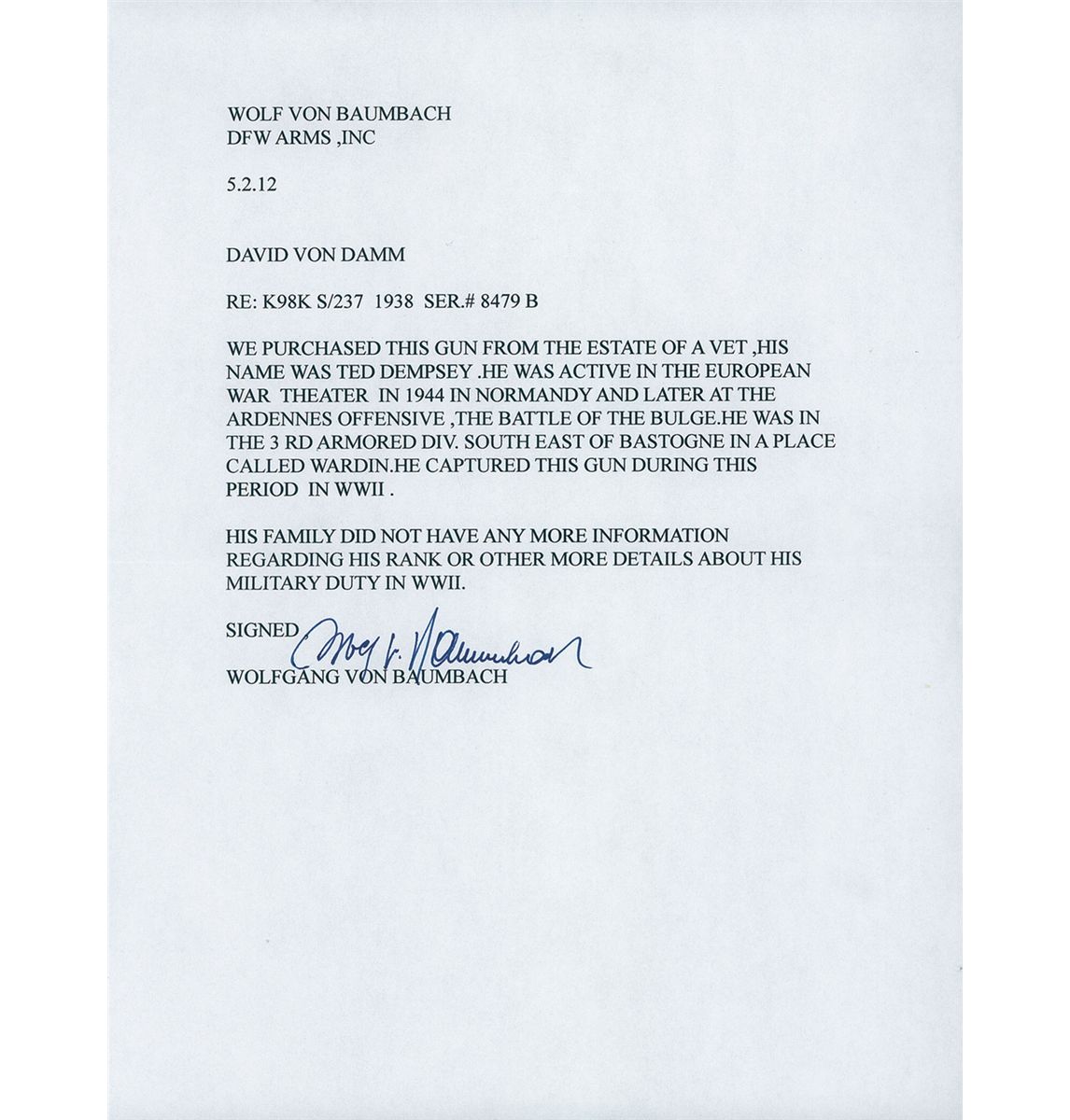 Manufactured in 1938. With letter from Wolfgang Von Baumbach stating the rifle was captured by Ted Dempsey in Germany.