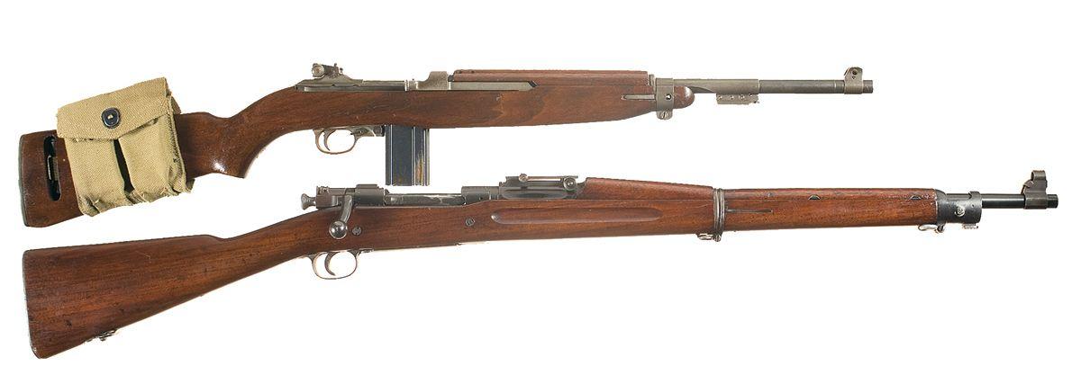 A) WWII Winchester carbine with late features, rebuilt with mixed parts and some late Inland parts. Top barrel marked "bomb/W.R.A./11-42" with circled "P" proof ahead of pistol grip. Complete with detachable magazine, green canvas sling and "USMC/BOYT" marked two-magazine pouch.