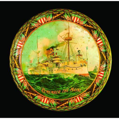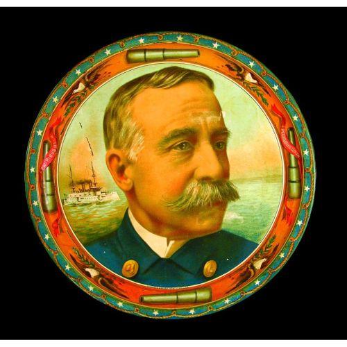 Admiral Dewey Tin Serving Tray, blemish on his forehead and scratch at 10:00 otherwise very good condition. And Remember the Maine Tin Serving Tray, nail whole at 12:00 otherwise excellent condition, Both 12 inch diameter.