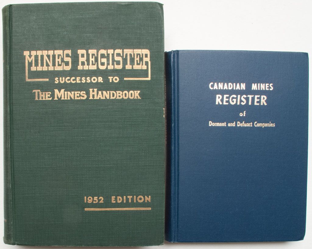 1) The perfect way to find Canadian mines. The Canadian Mines Register of Dormant and Defunct Companies. 1971. 2) Mines Register: Successor to the Mines Handbook. 1952. GREAT resources for mining stock collectors!!!